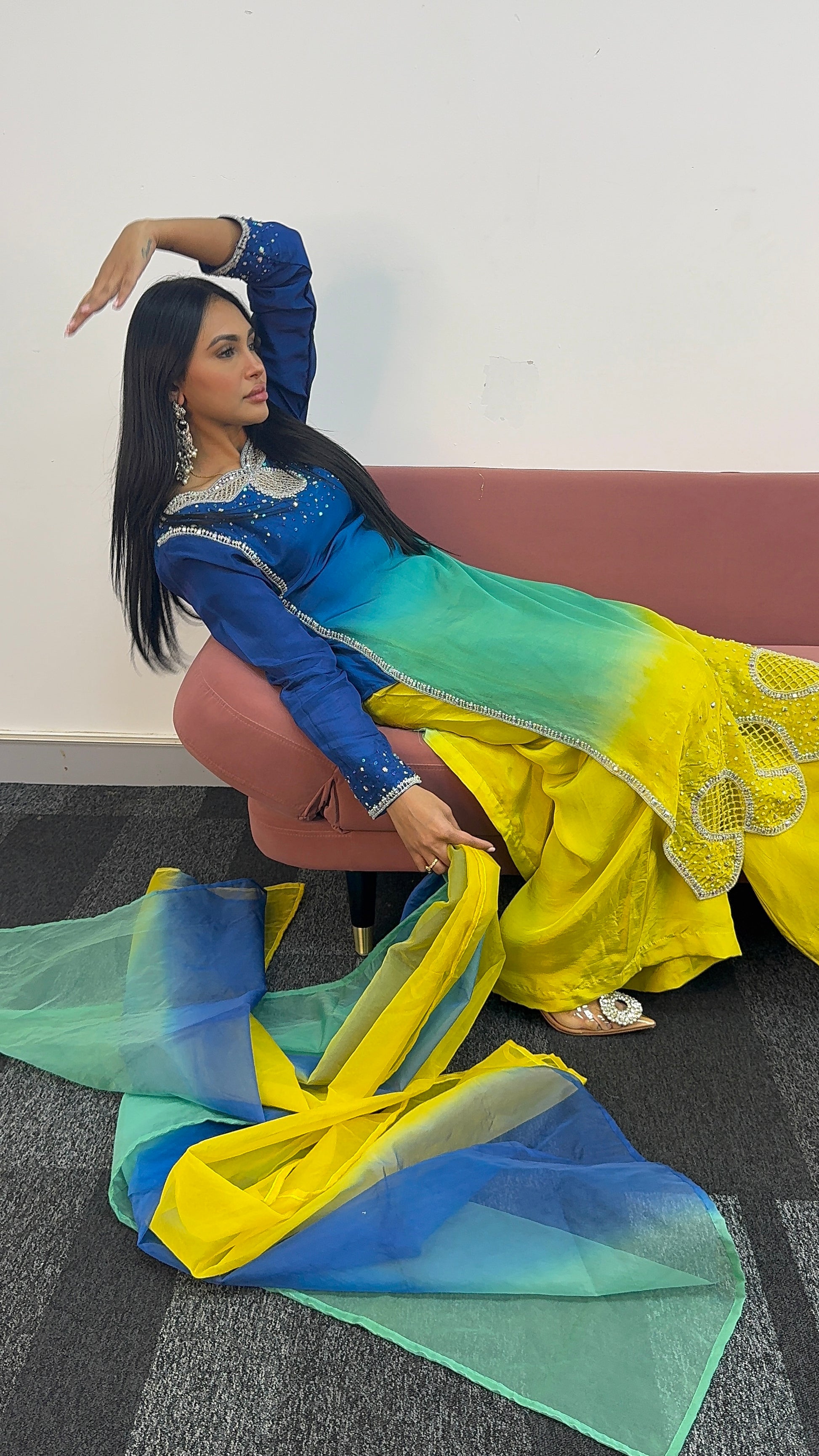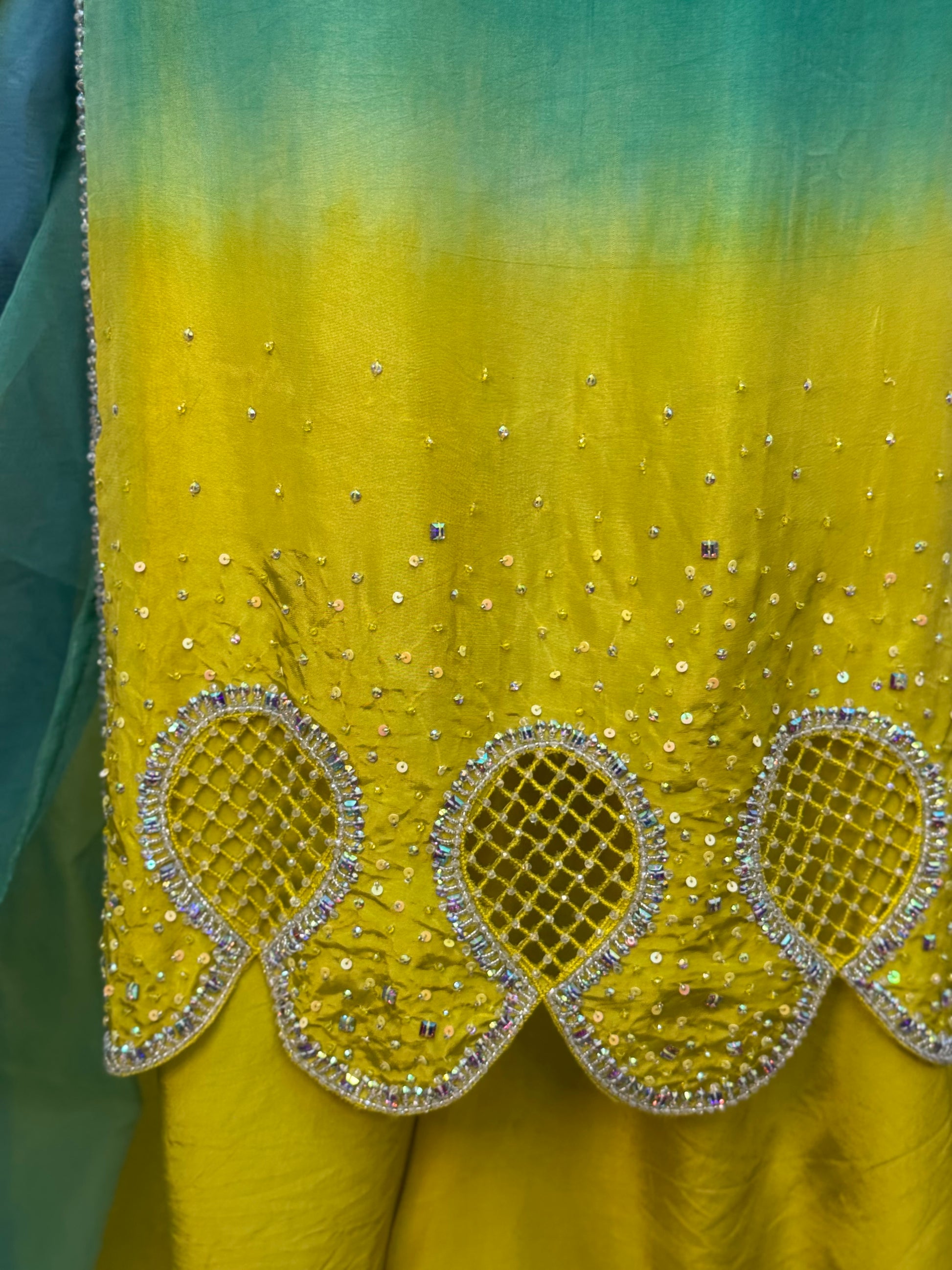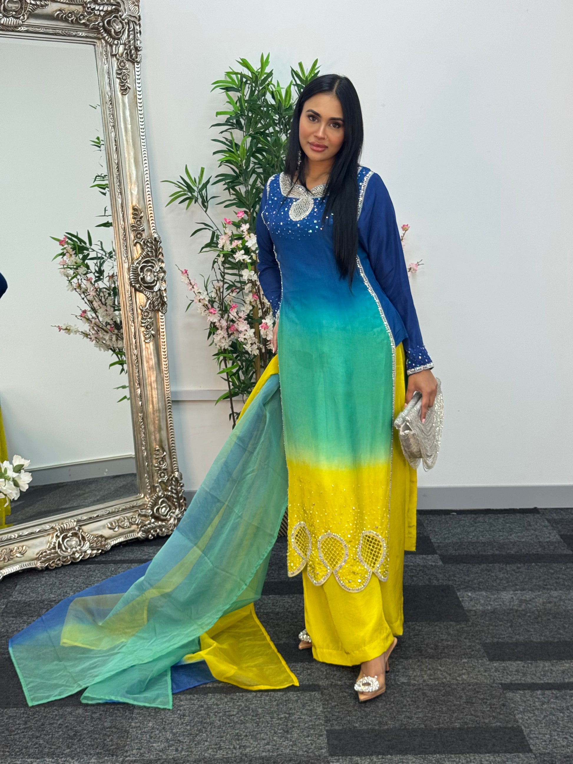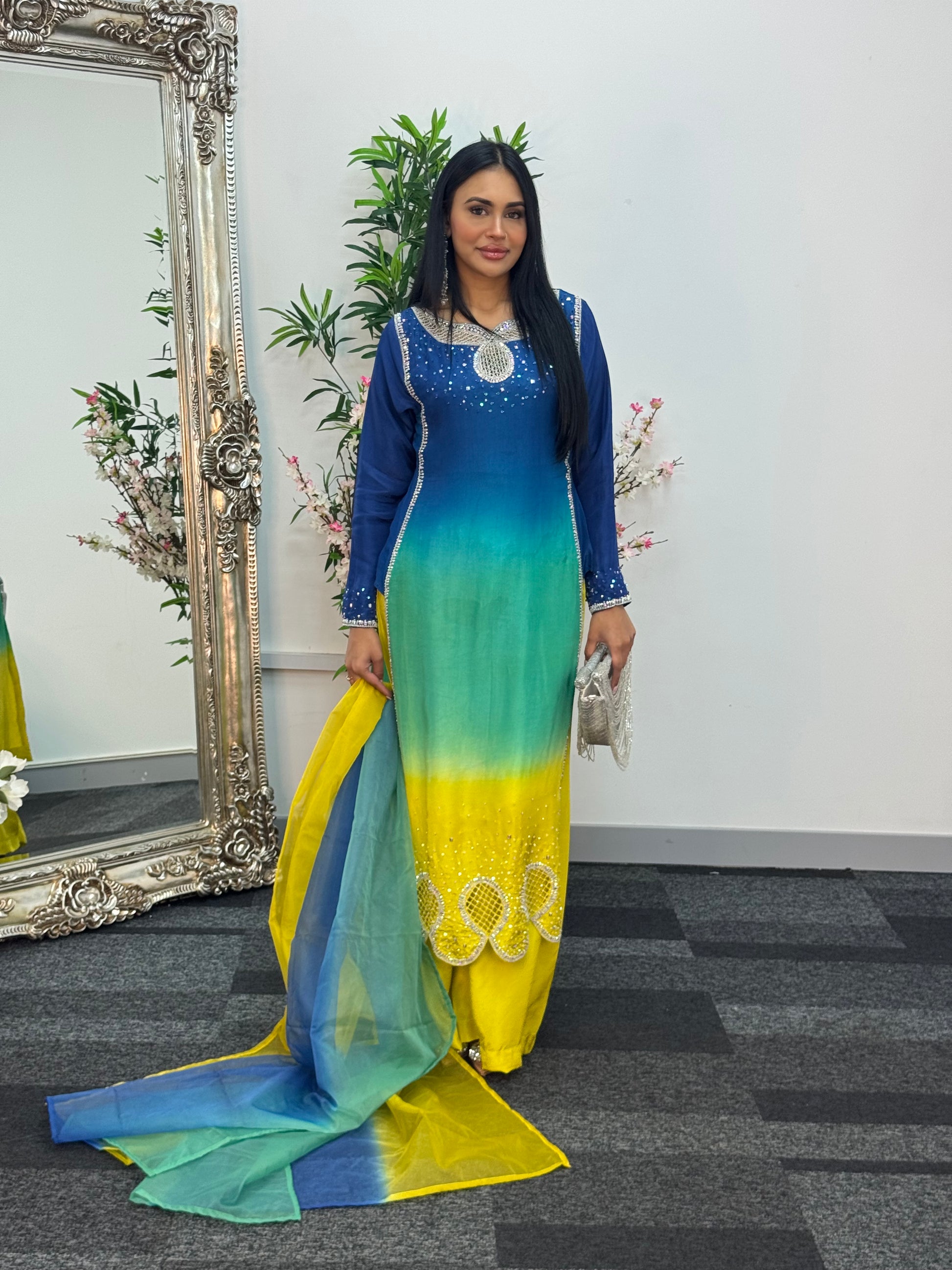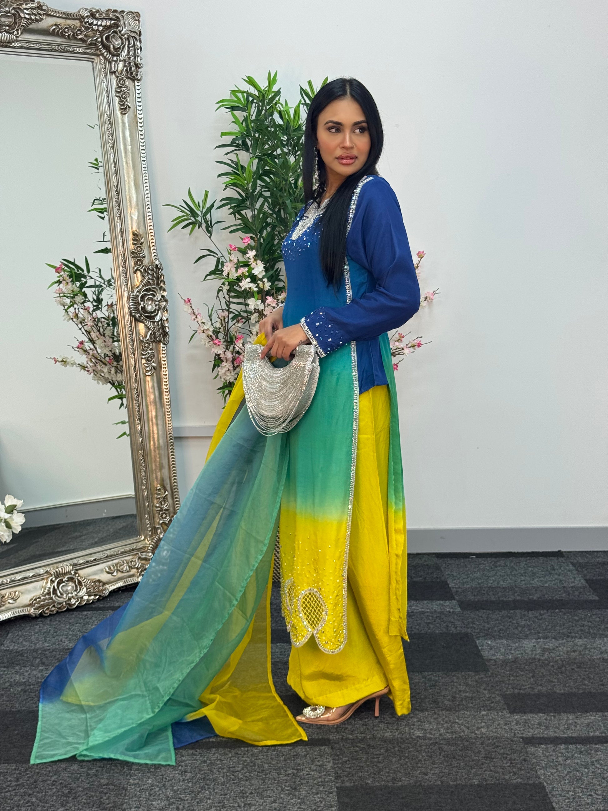 Beautifully embellished with intricate handwork and crystal detailing, this ensemble features elegant flared trousers and a luxurious three-tone dupatta —