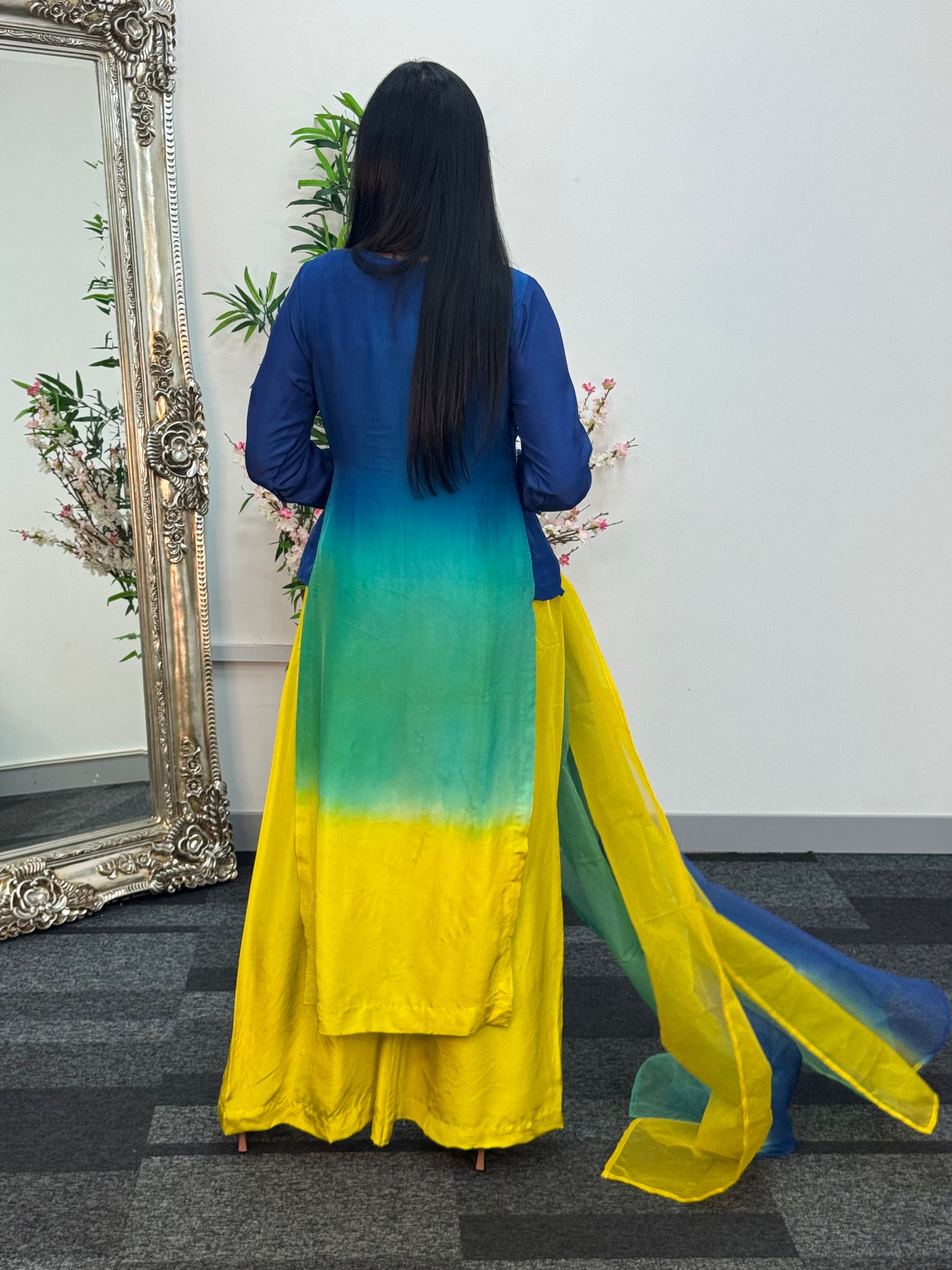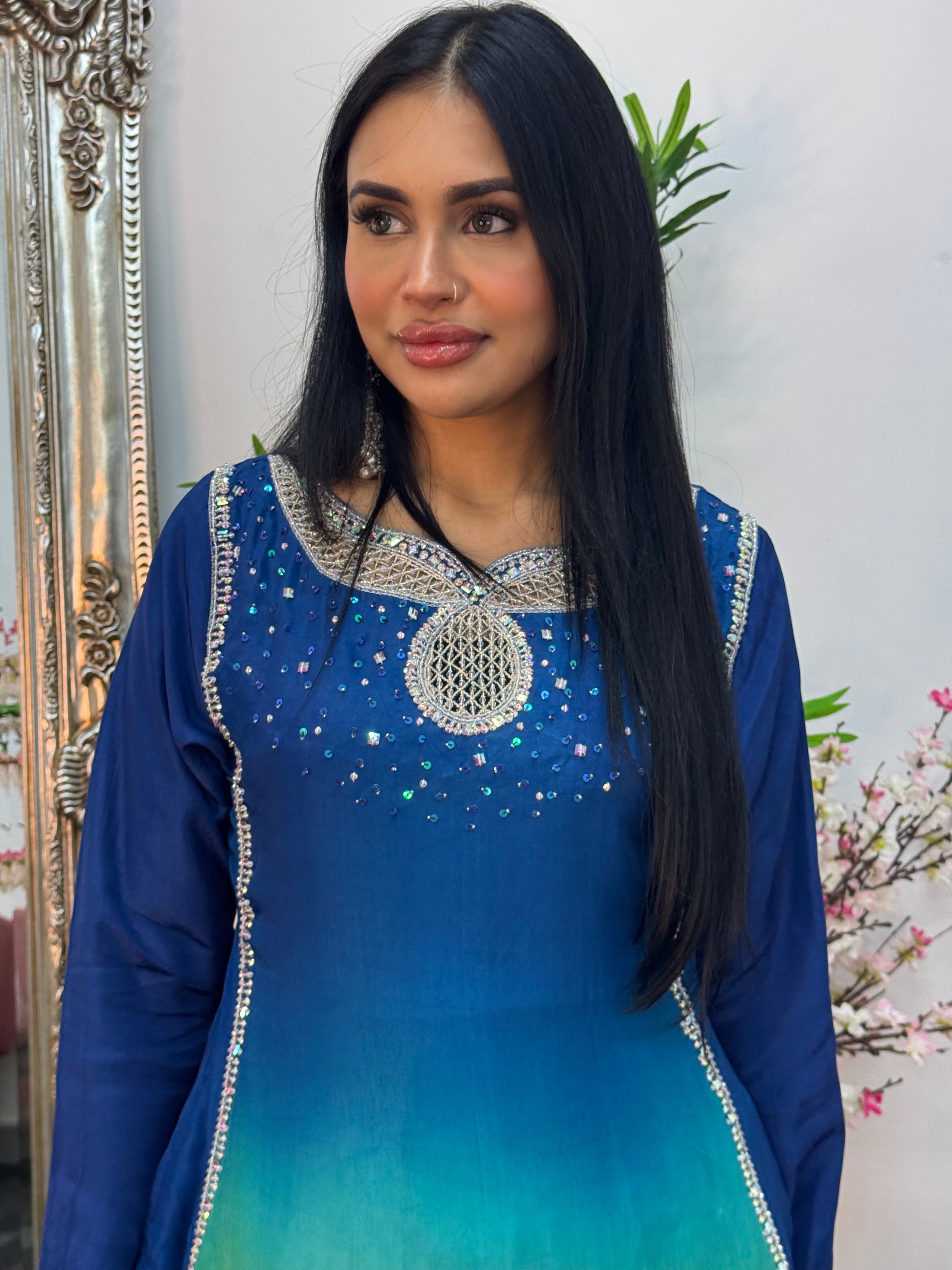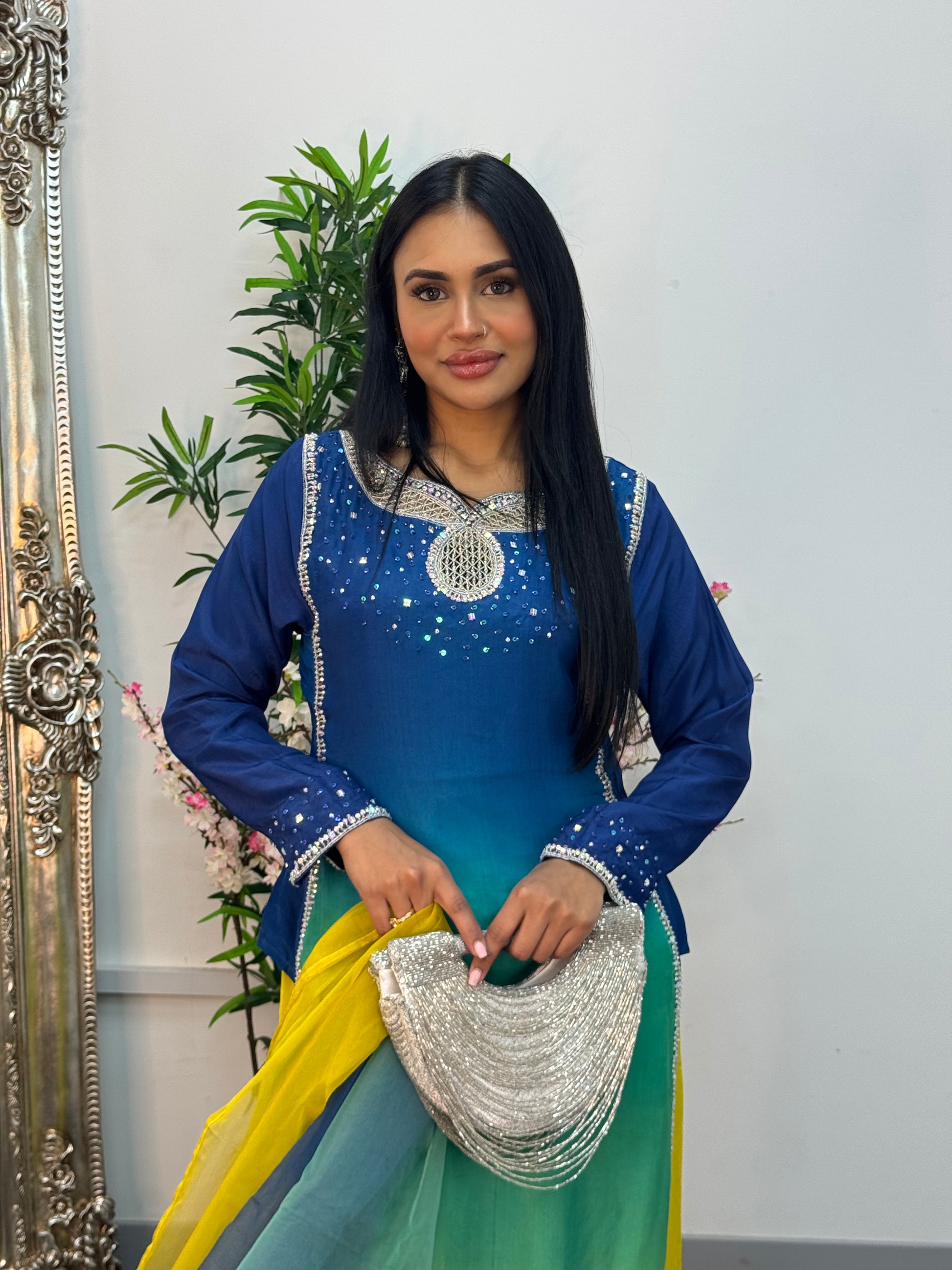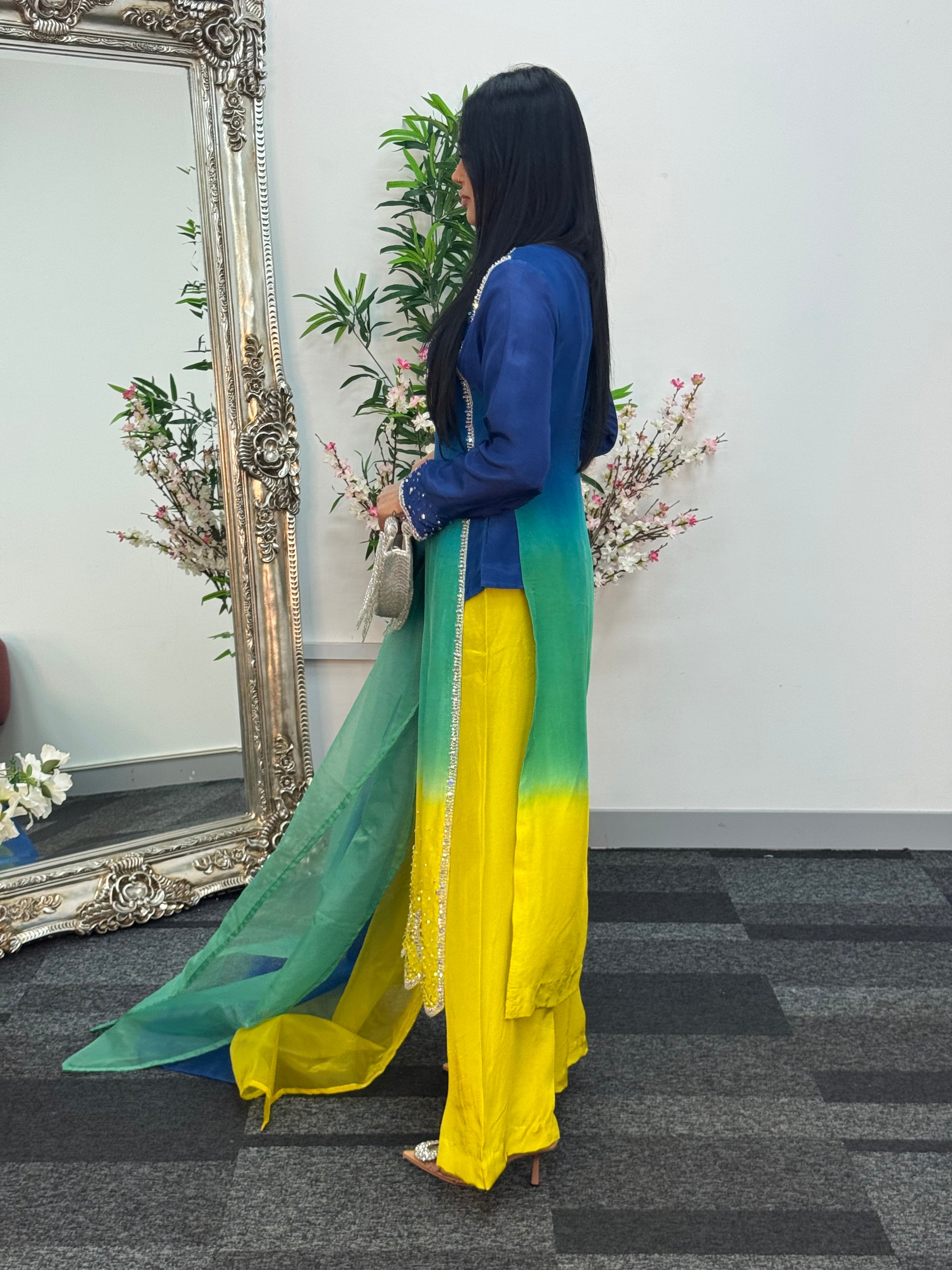 Beautifully embellished with intricate handwork and crystal detailing, this ensemble features elegant flared trousers and a luxurious three-tone dupatta —