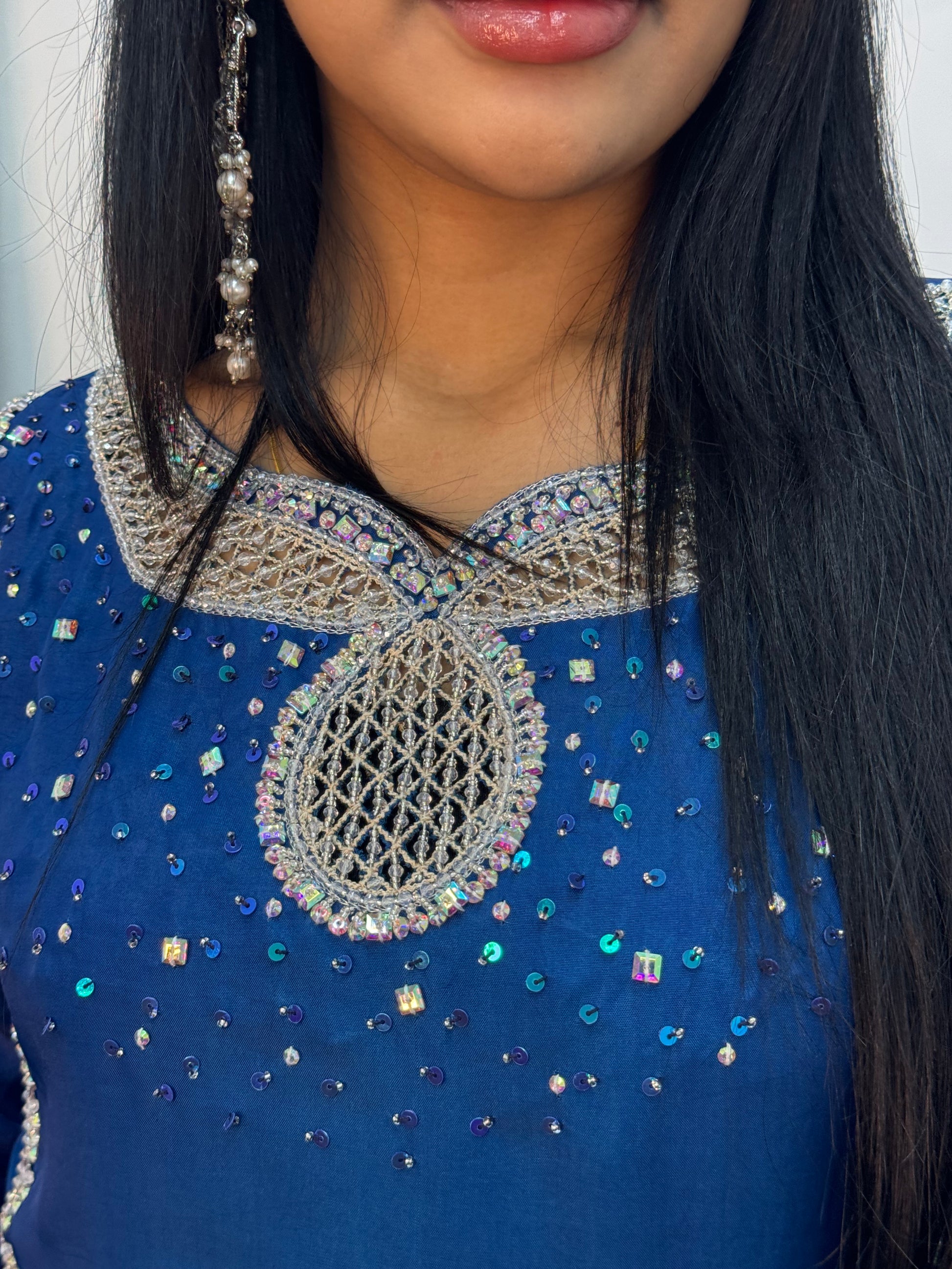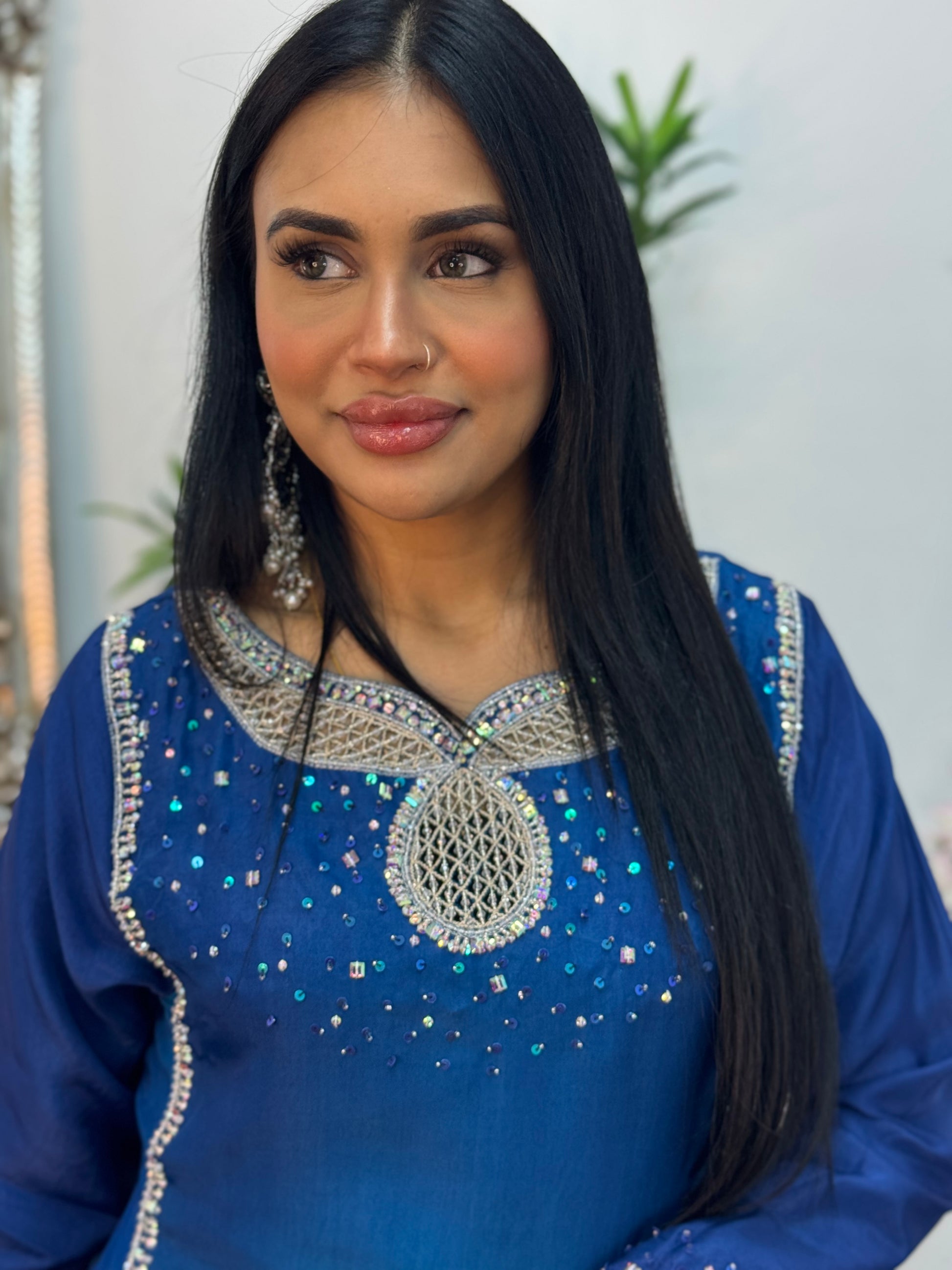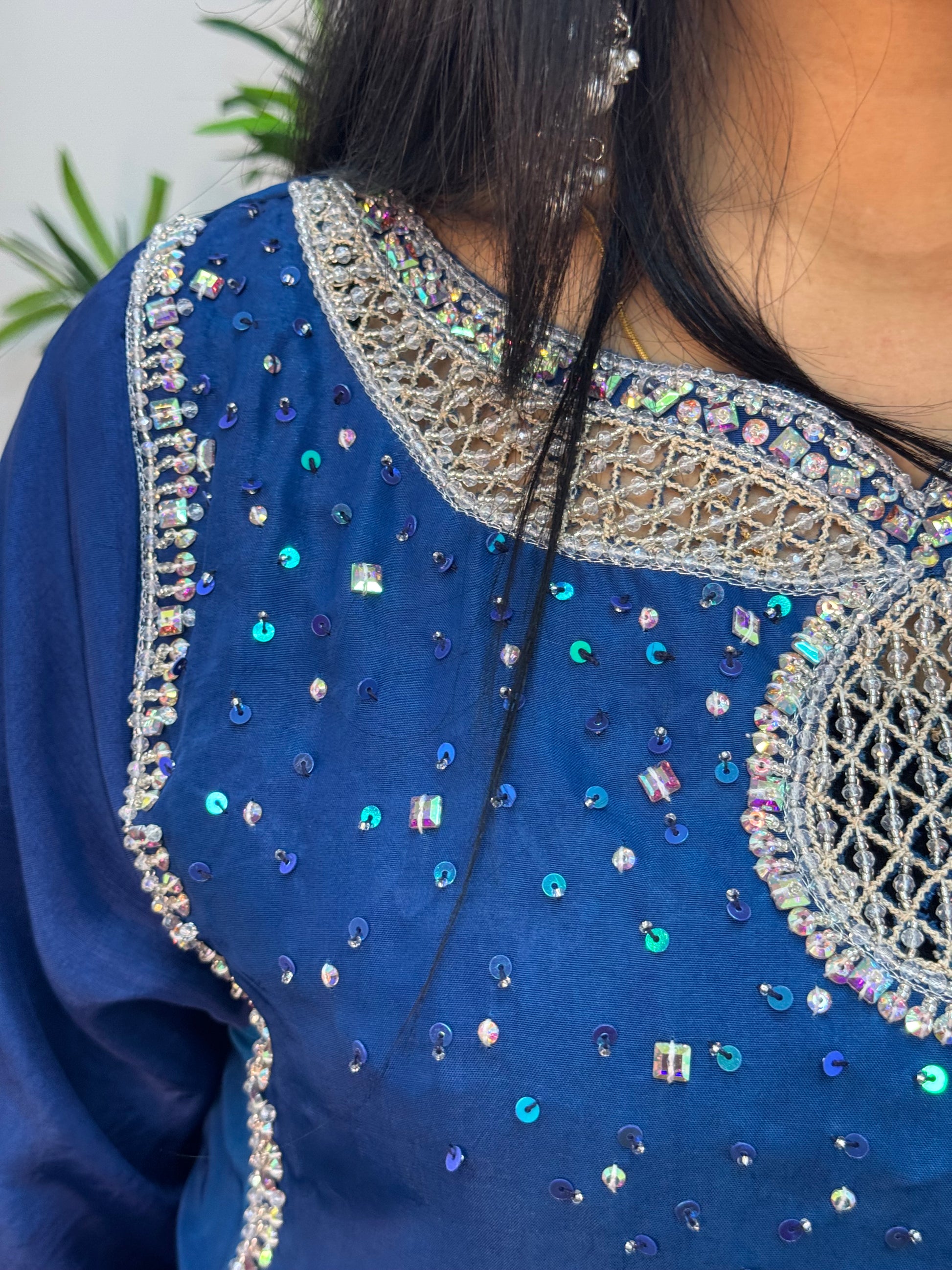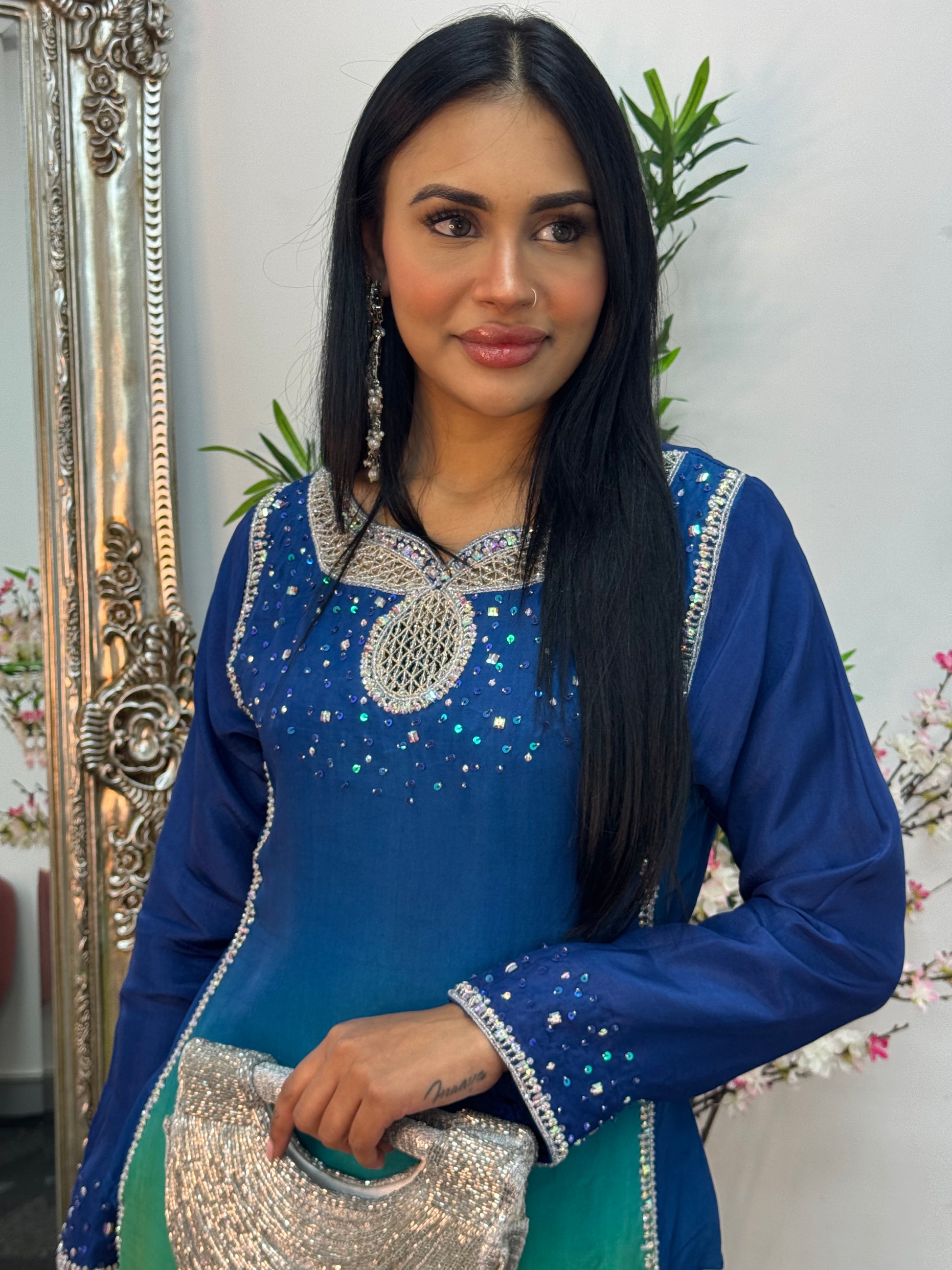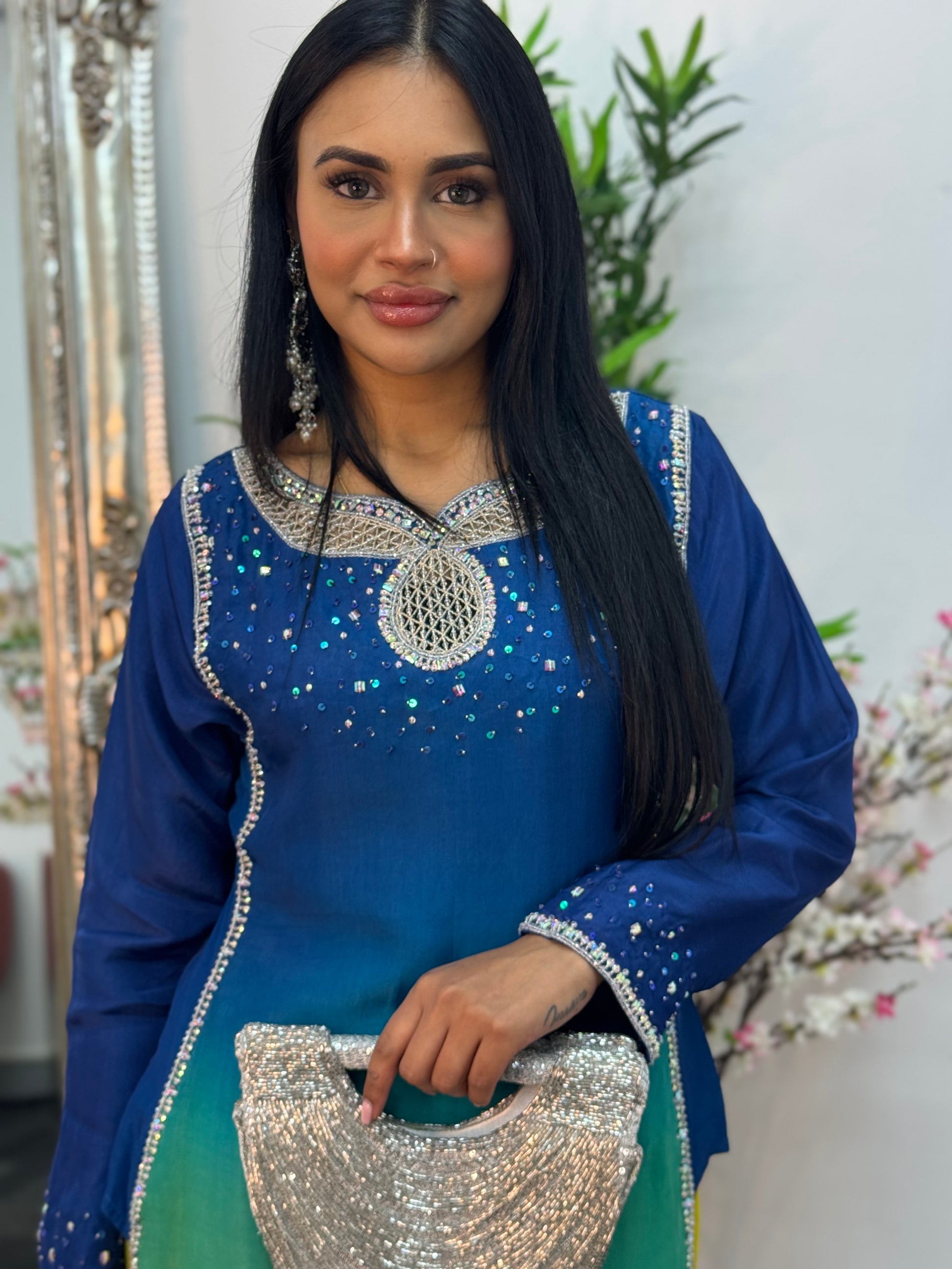 Beautifully embellished with intricate handwork and crystal detailing, this ensemble features elegant flared trousers and a luxurious three-tone dupatta —
