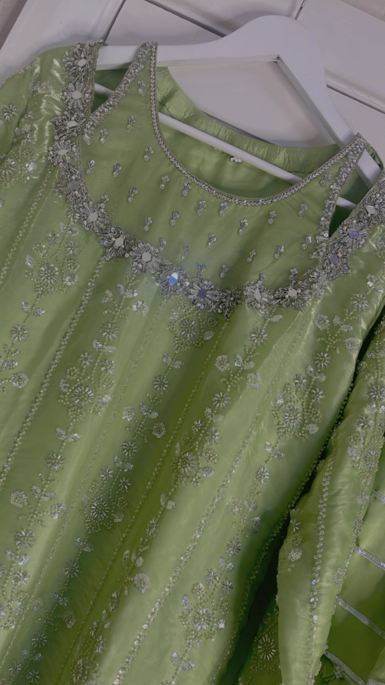 • Neckline Opulence: An adda/dabka work neckline elevates the design with intricate metal thread embroidery.