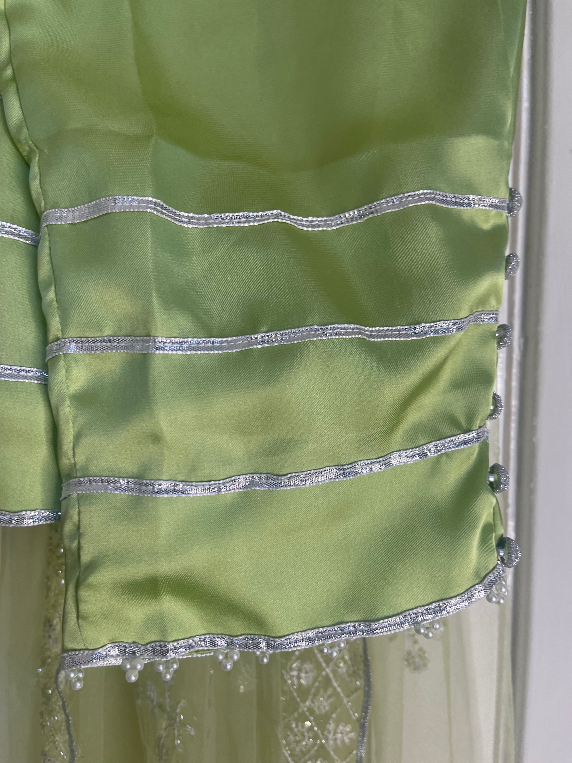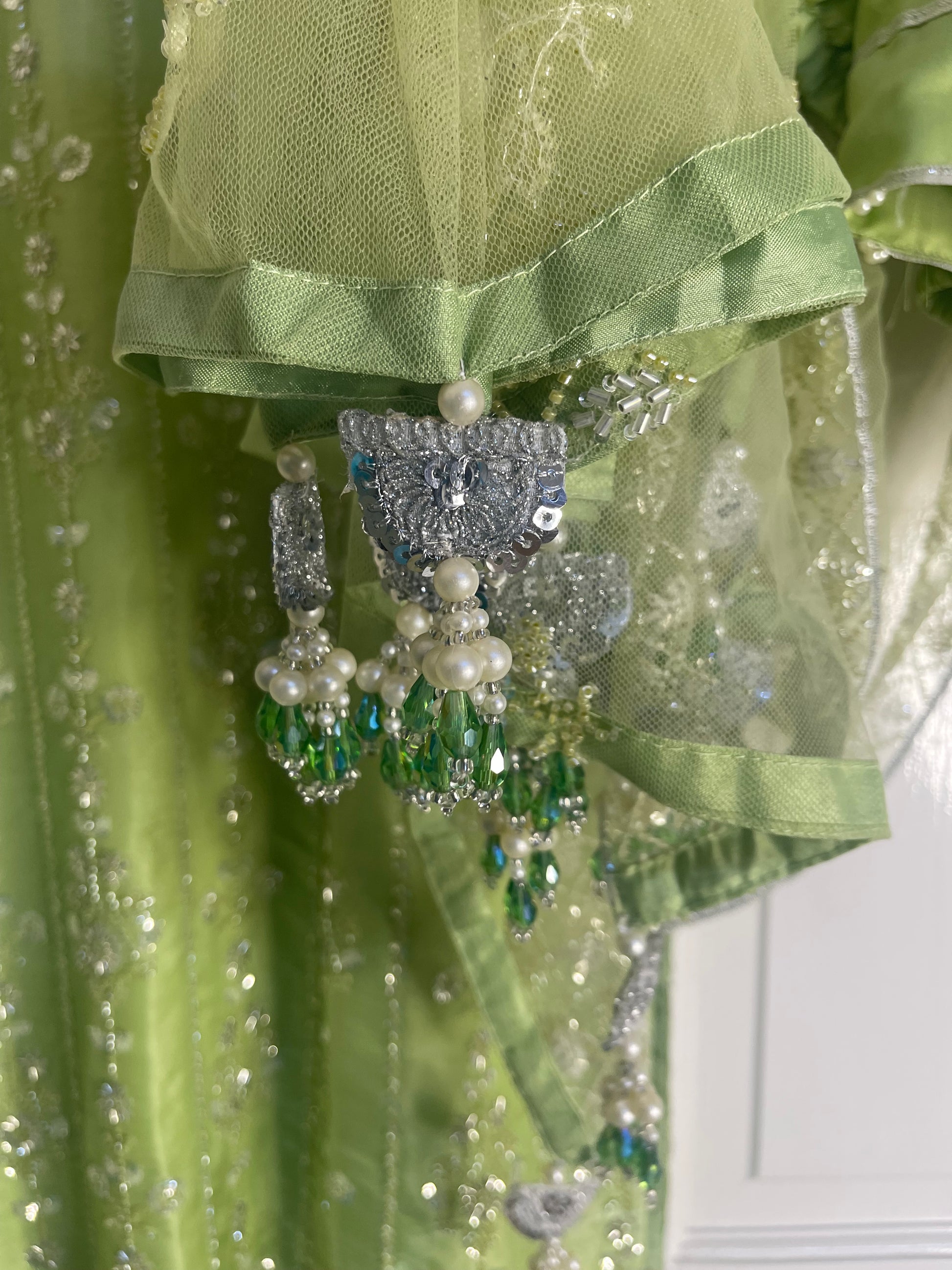 • Sleeve Embellishments: Delicate crystal hangings grace the sleeves, adding a touch of refined sparkle with every movement.
