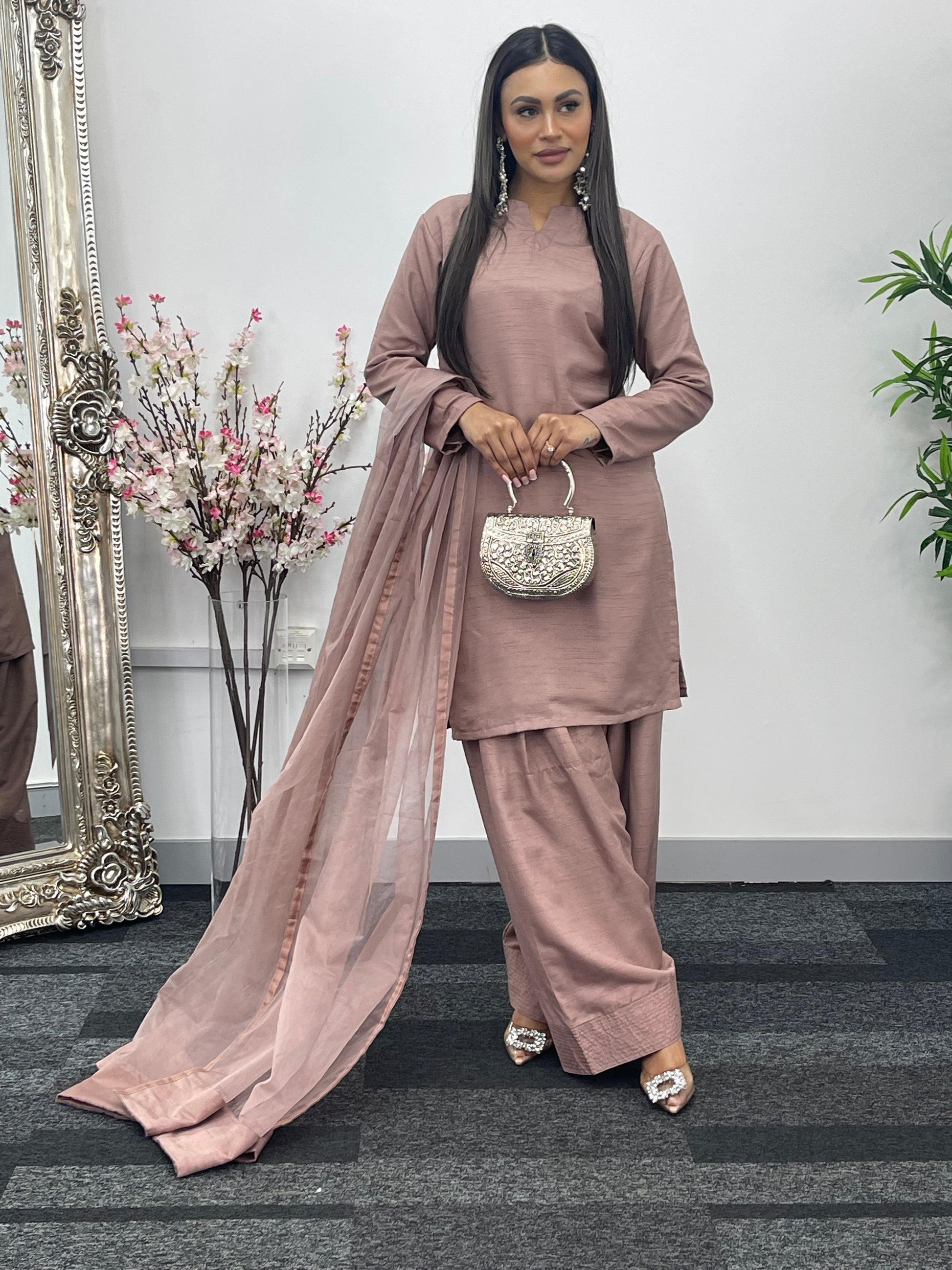 This exquisite ensemble features a raw silk shirt paired with a matching shalwar, ensuring both elegance and comfort.