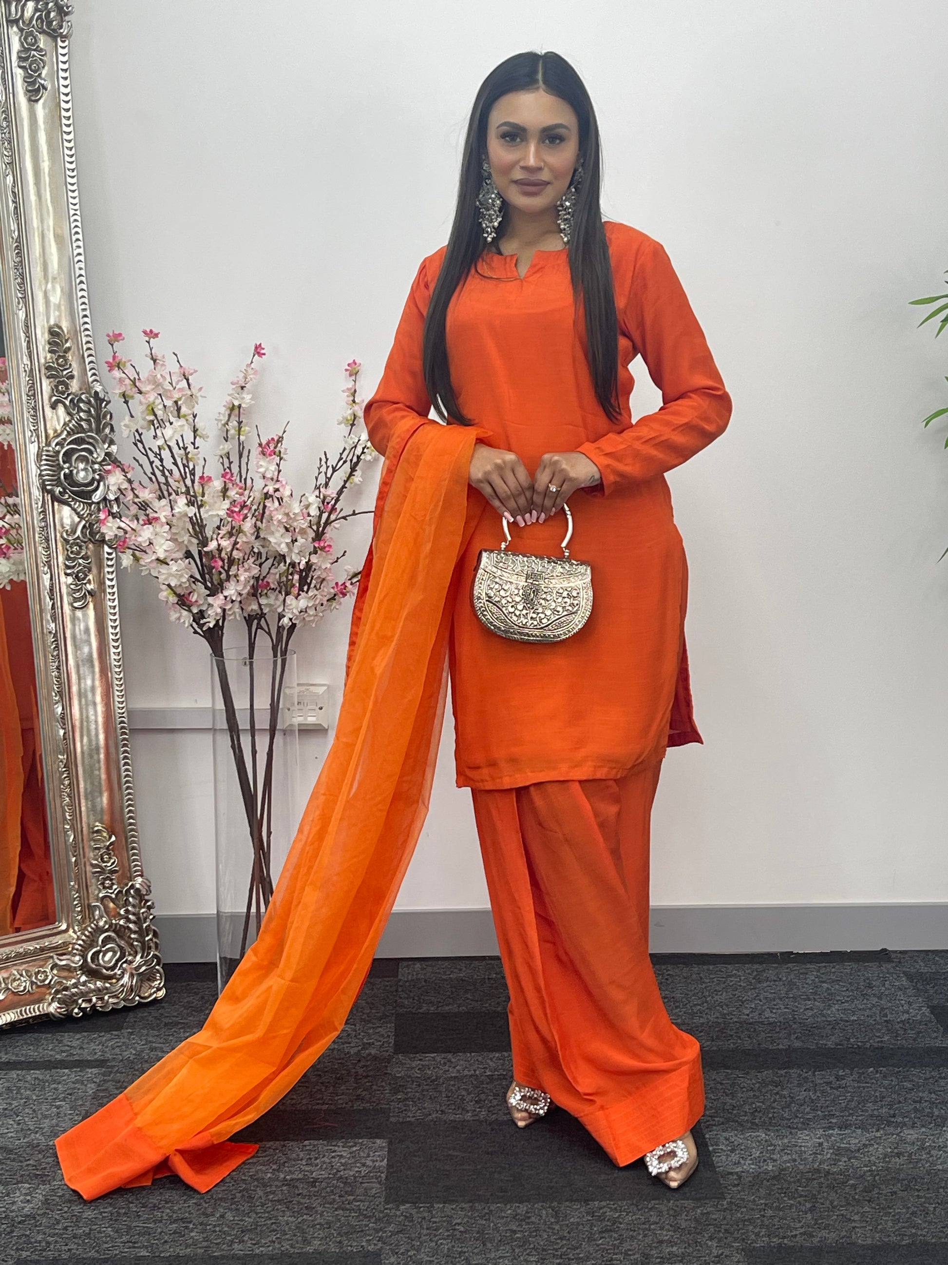 The shirt is thoughtfully lined for added luxury, while the ensemble is complemented by an elegant organza dupatta adorned with a beautifully detailed heavy palta on the pallu.