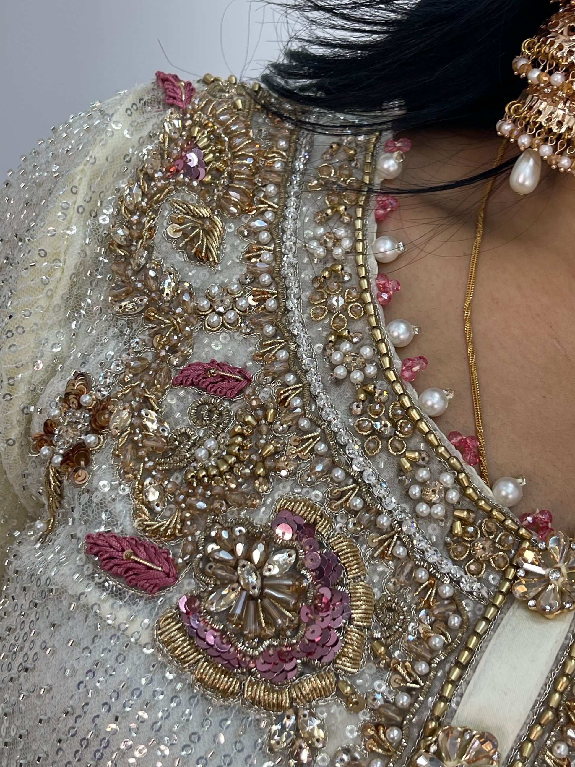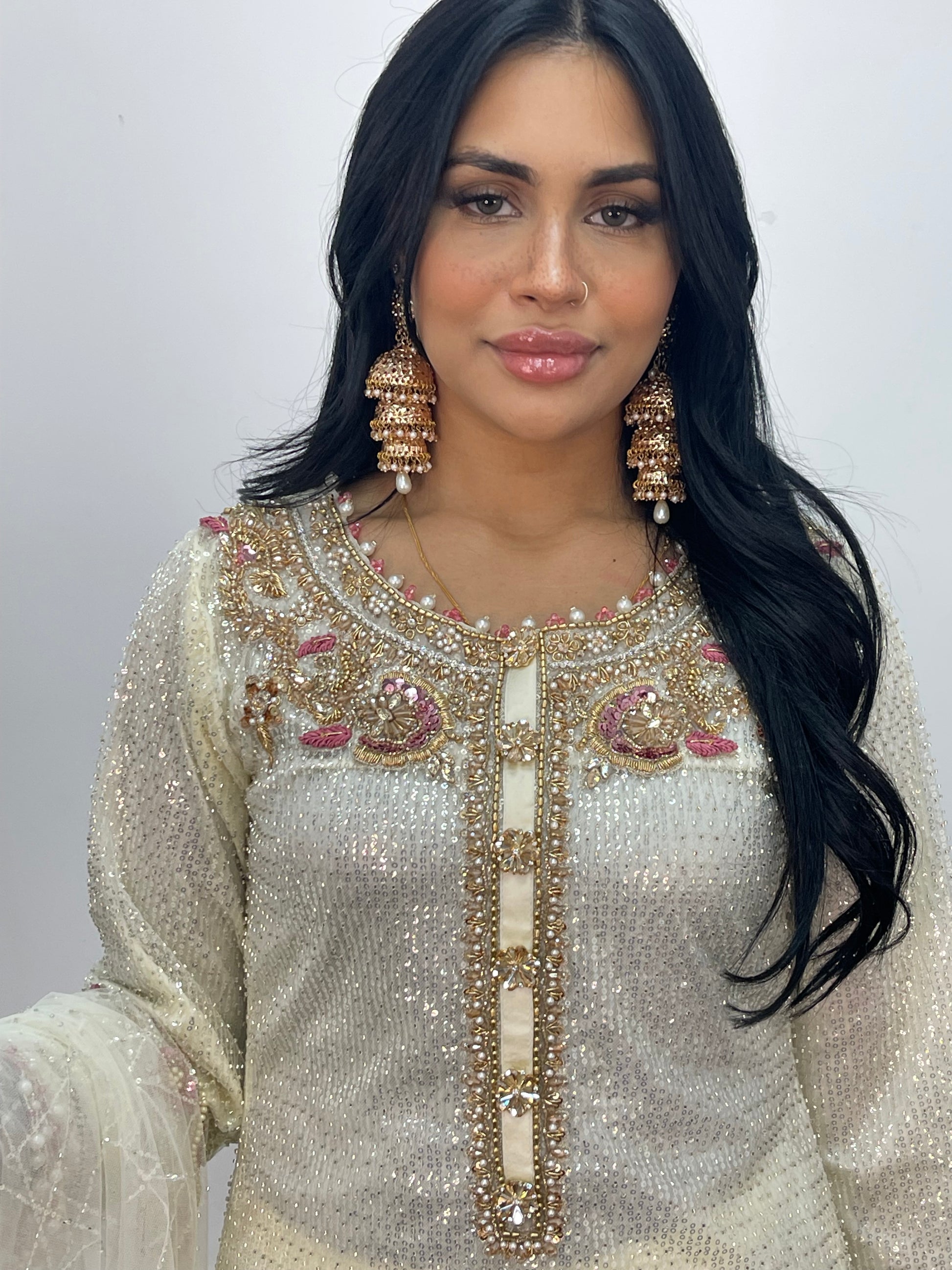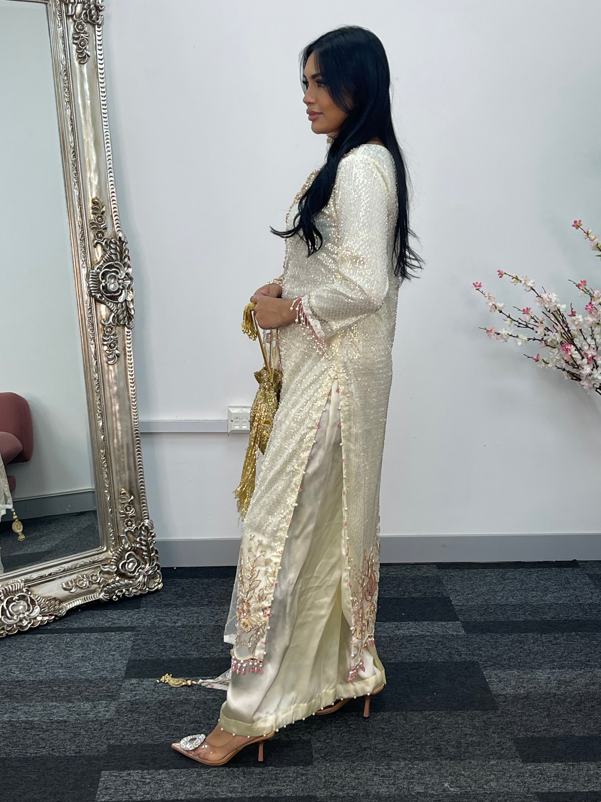 adda work on the neckline. This elegant piece features sleeves with crystal detailing and charming latkans.