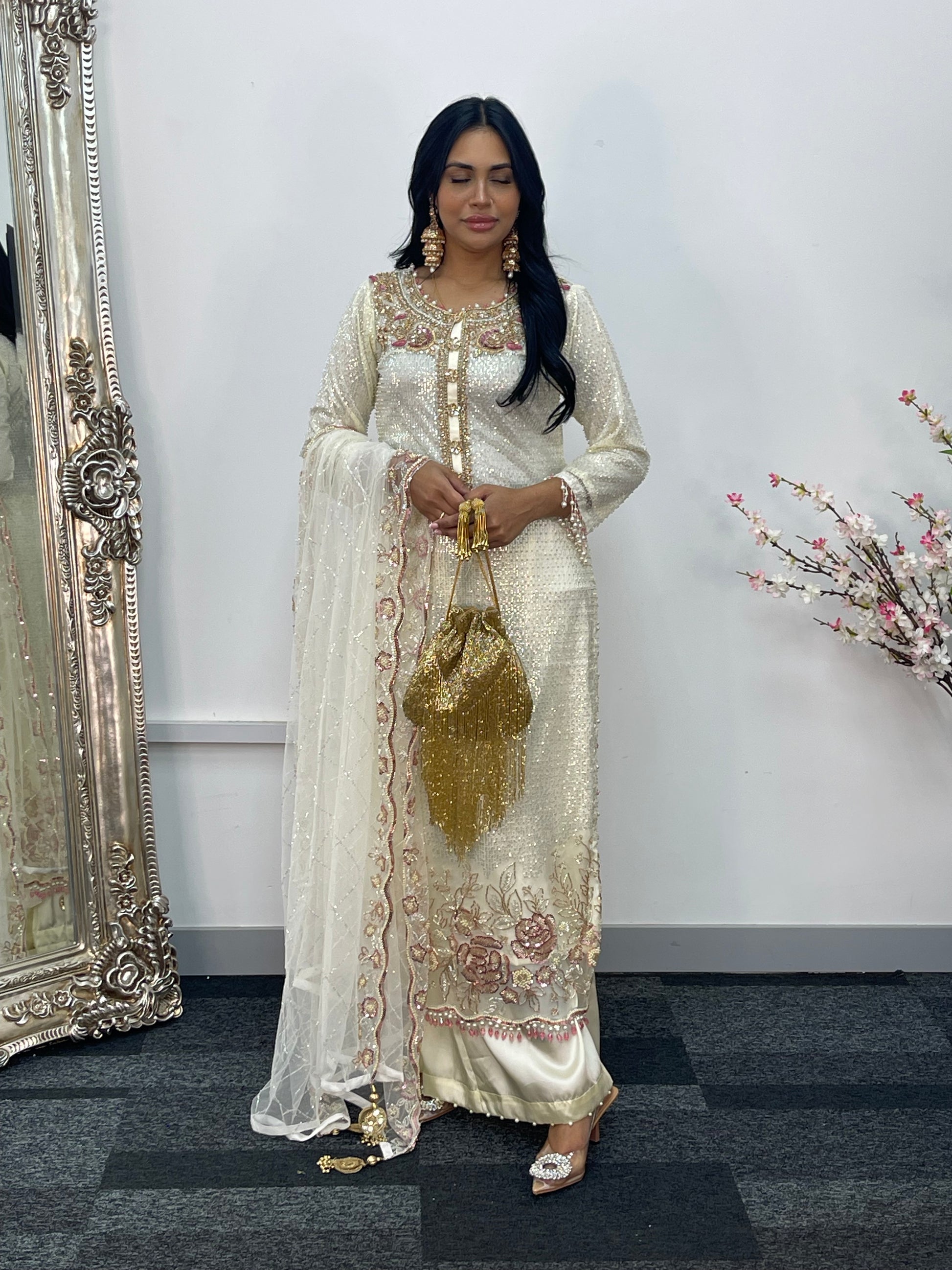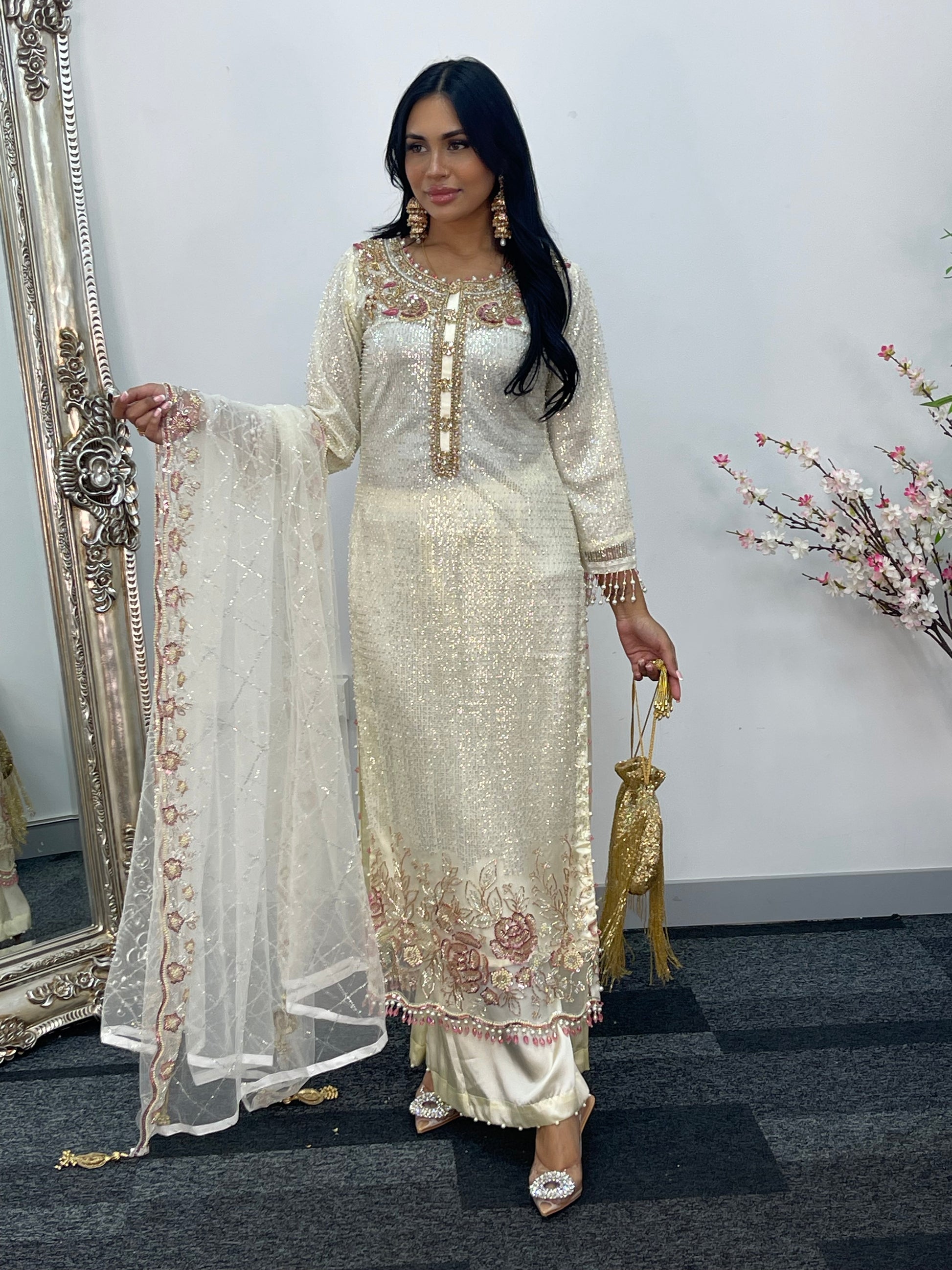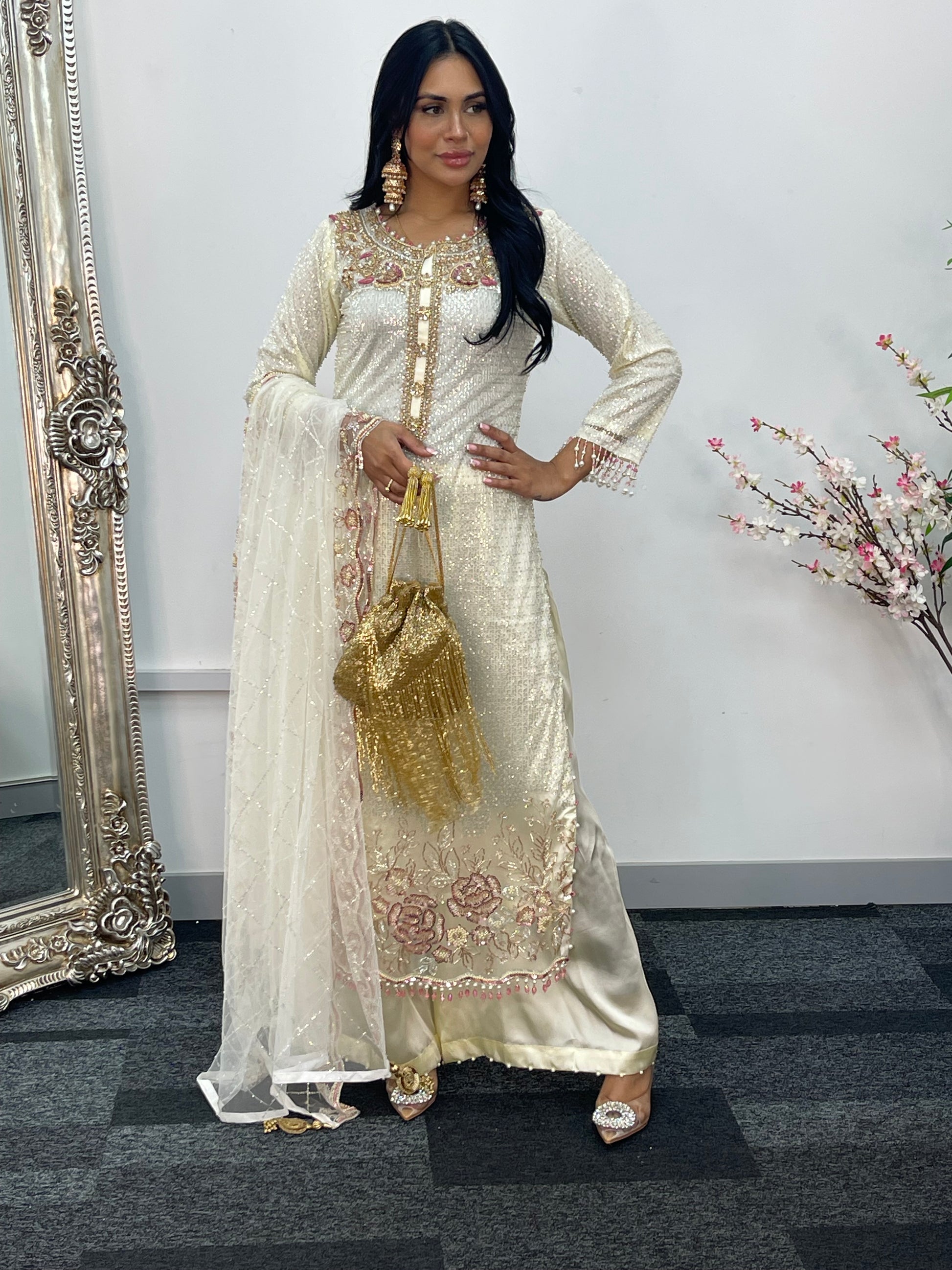 adda work on the neckline. This elegant piece features sleeves with crystal detailing and charming latkans.
