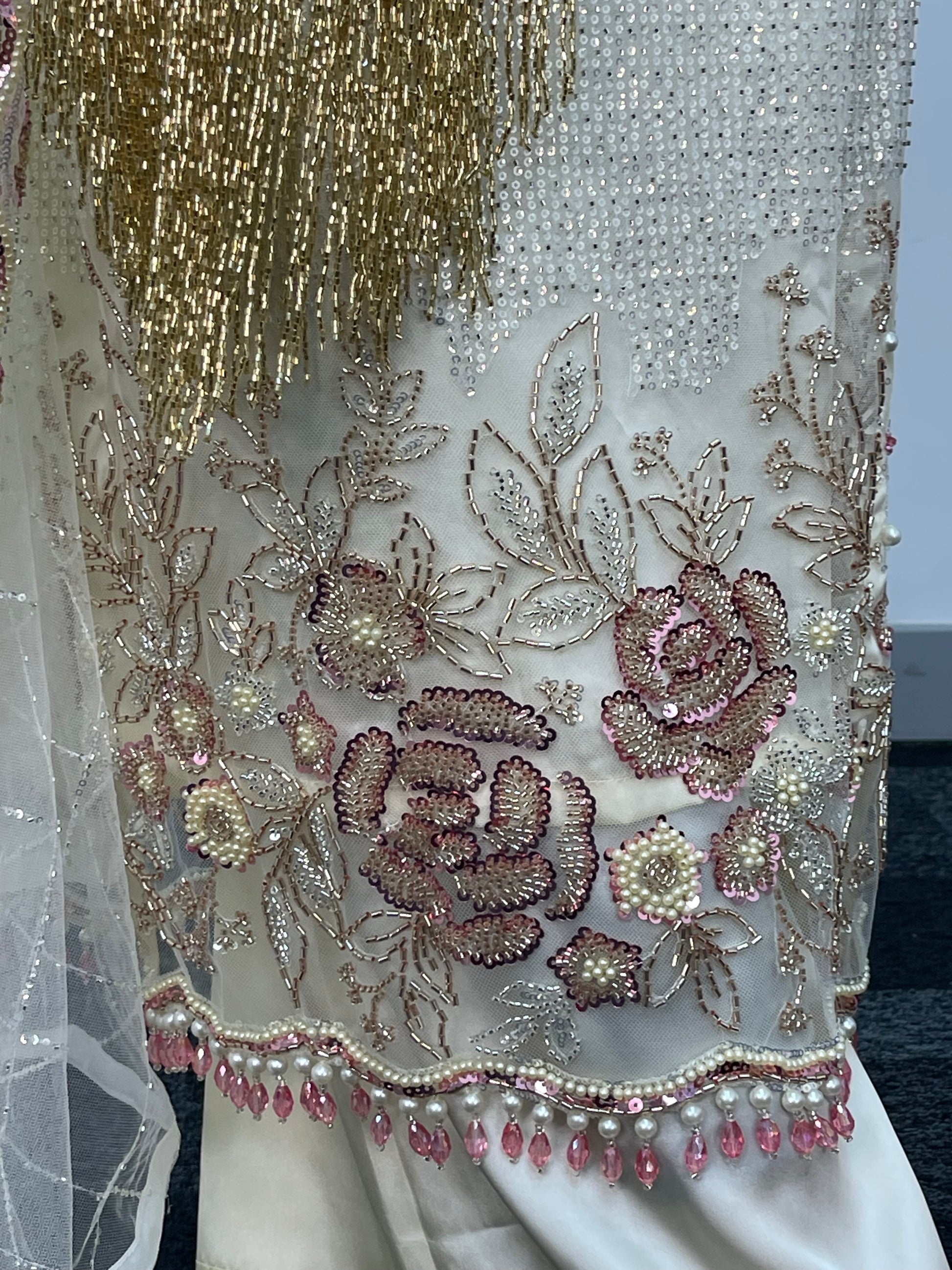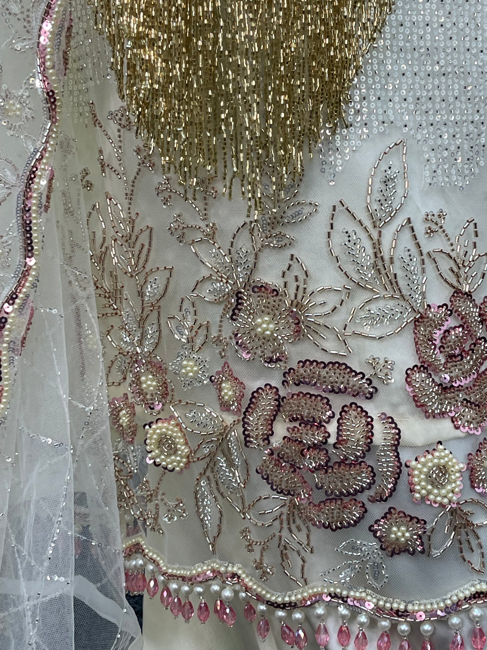 Completing the ensemble, a heavily embroidered silk dupatta embellished with delicate tassels flows beautifully.