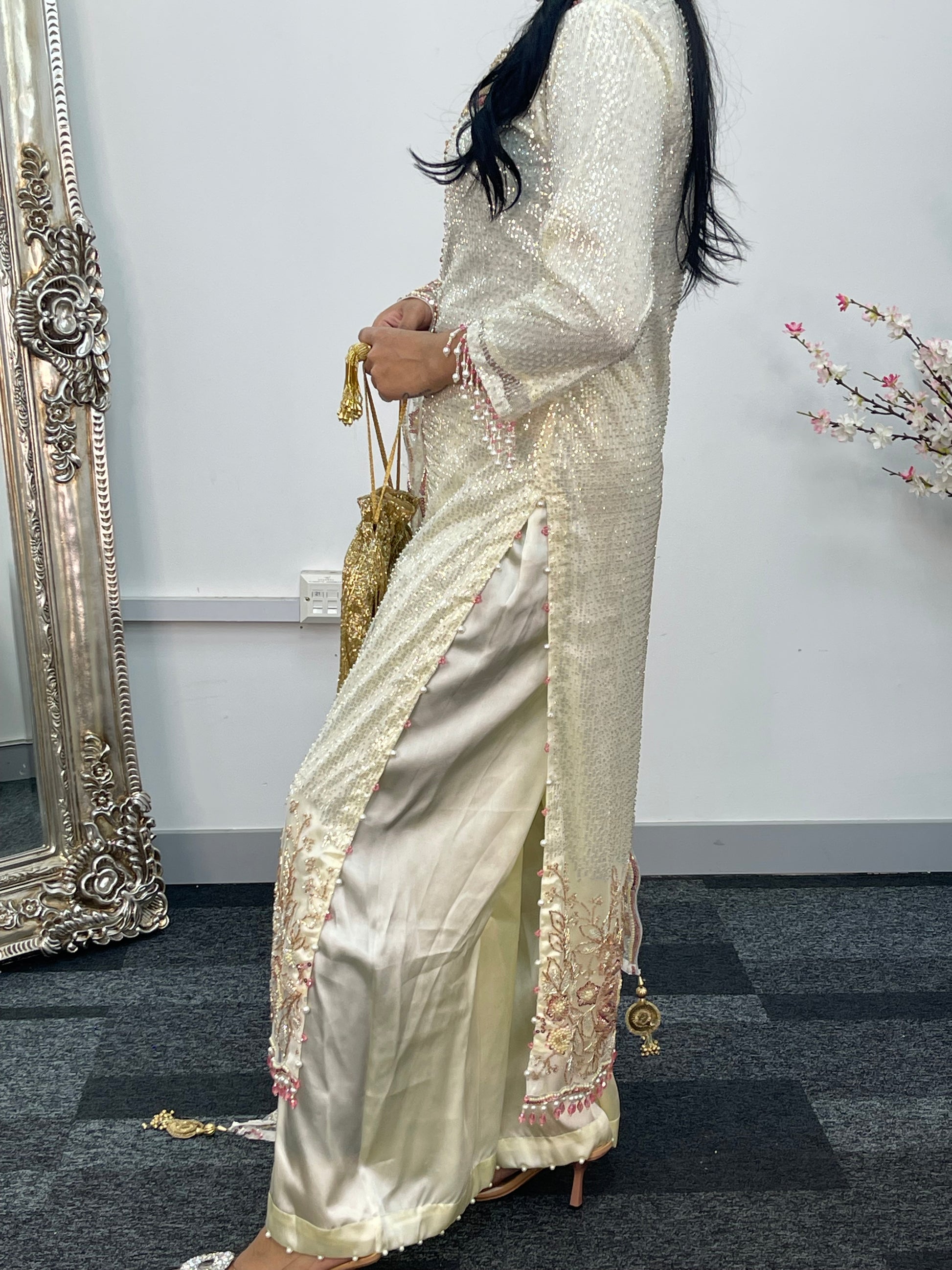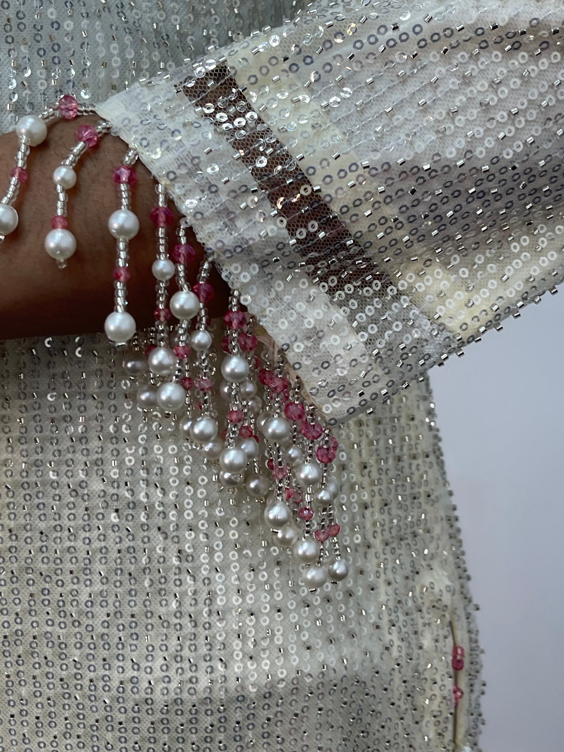 Accompanying the shirt, the plazO pants  are designed with exquisite pearl, adding a touch of luxury.