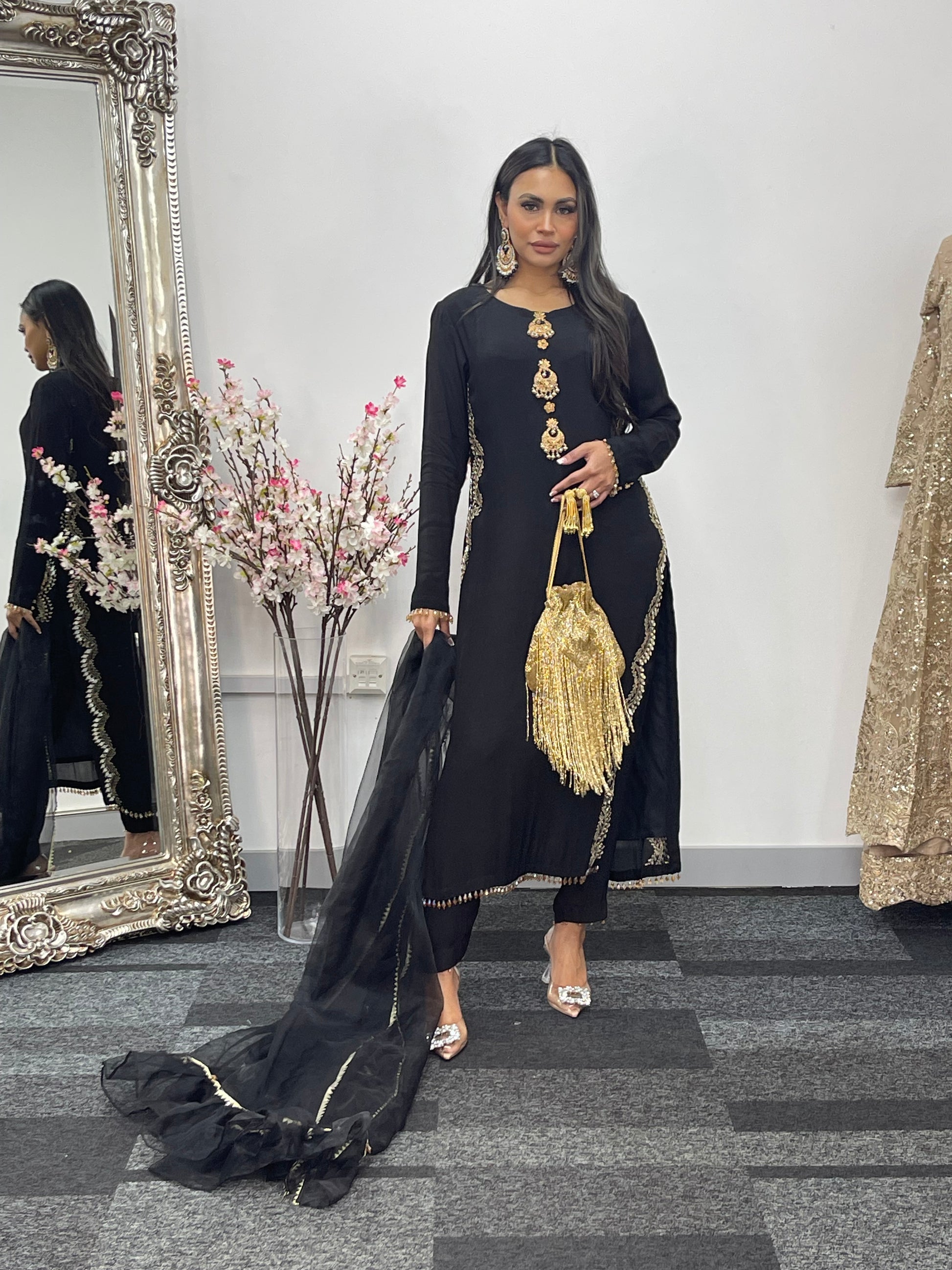 The front and back daman are enhanced with high-quality crystal detailing, while the sleeves are embellished with fancy buttons and crystal accents.