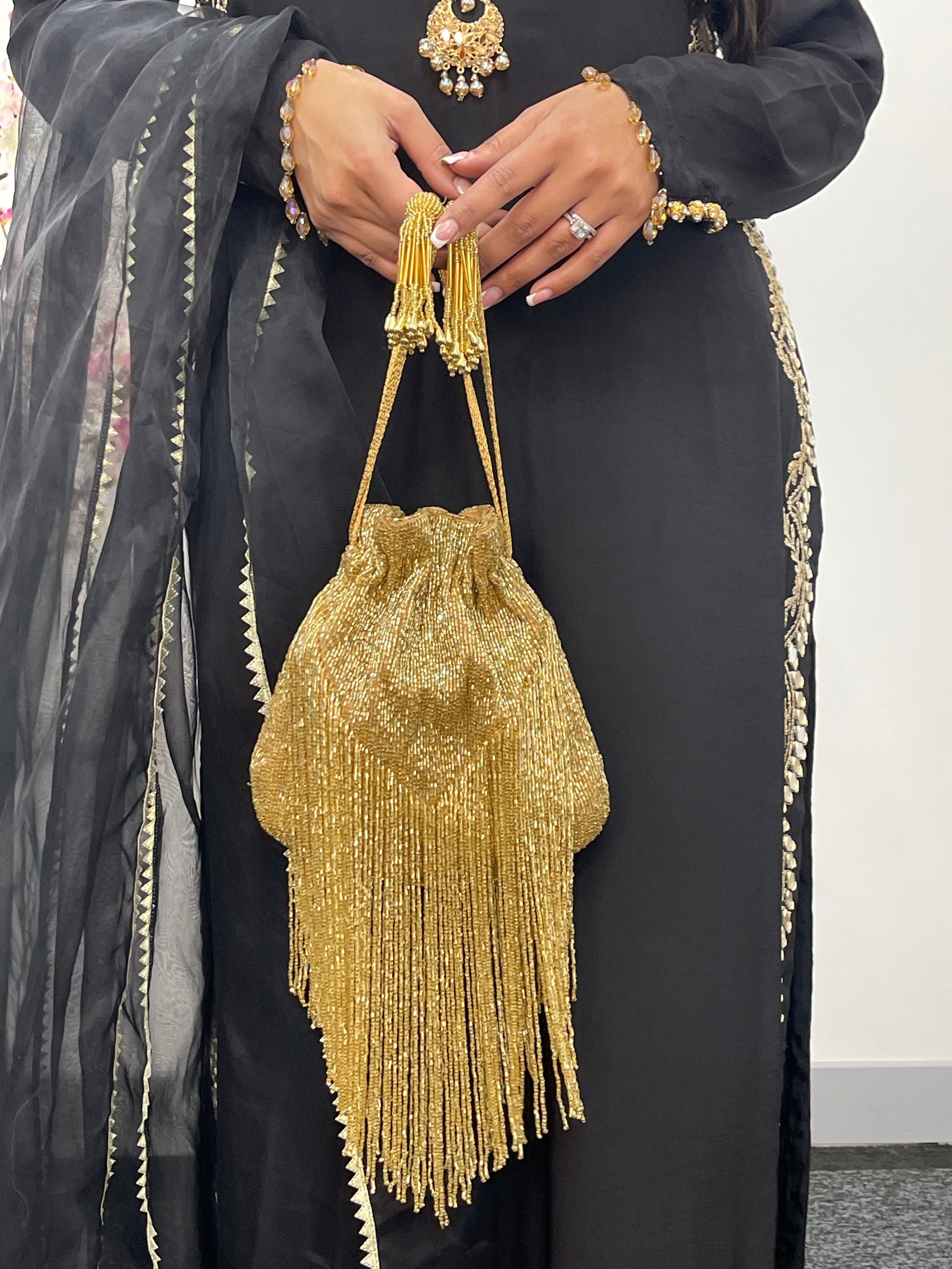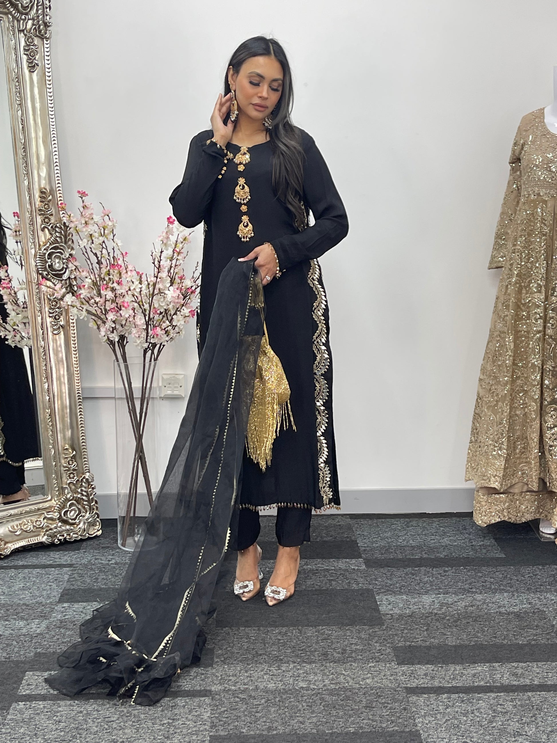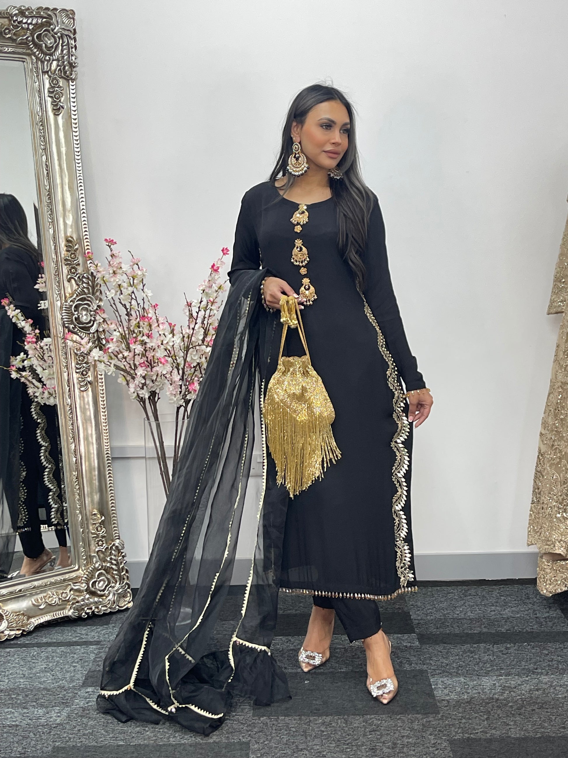 Additionally, the ensemble is paired with an organza dupatta, showcasing a four-sided gota trim and delicate frill detailing along the pallu.