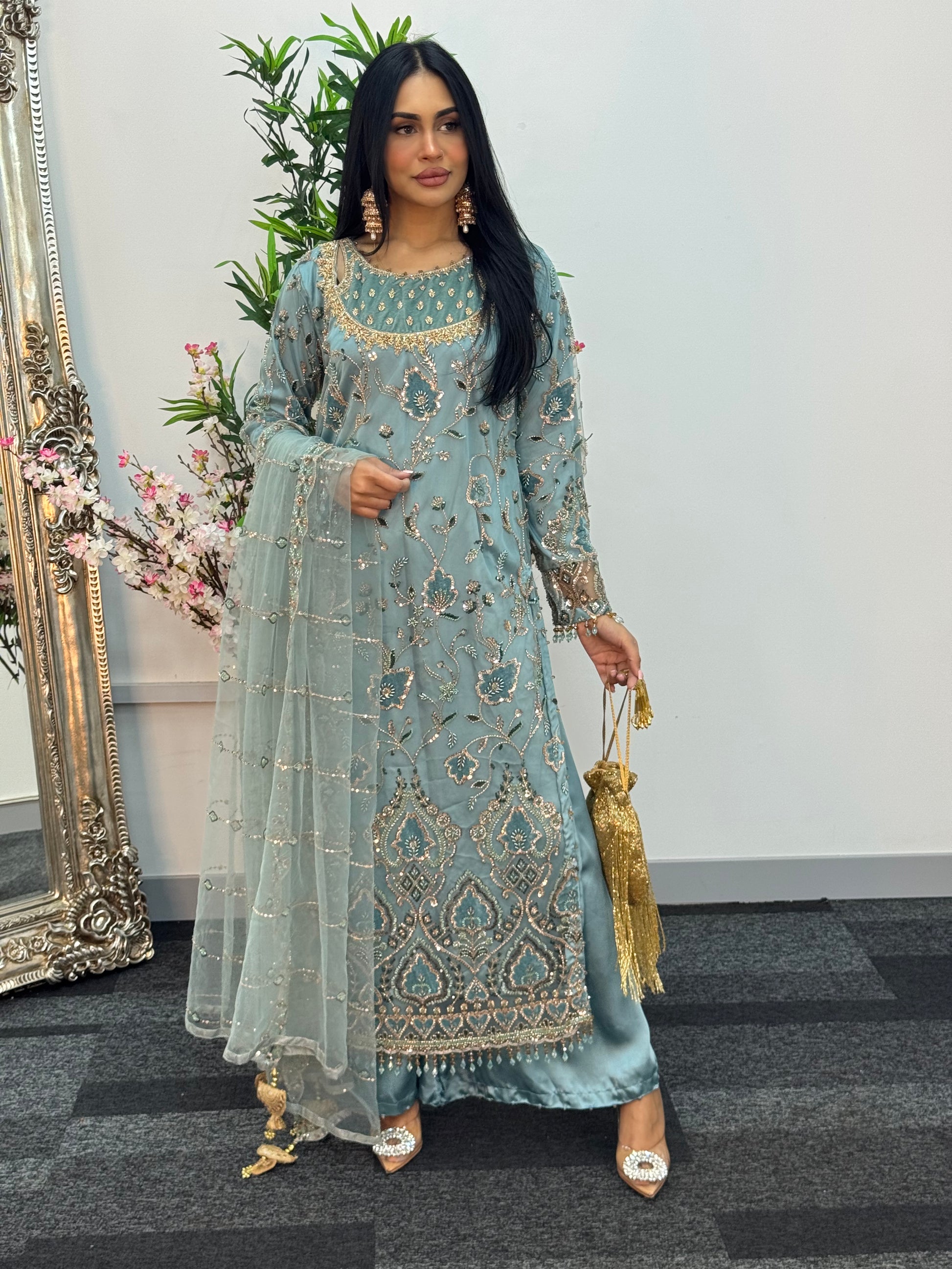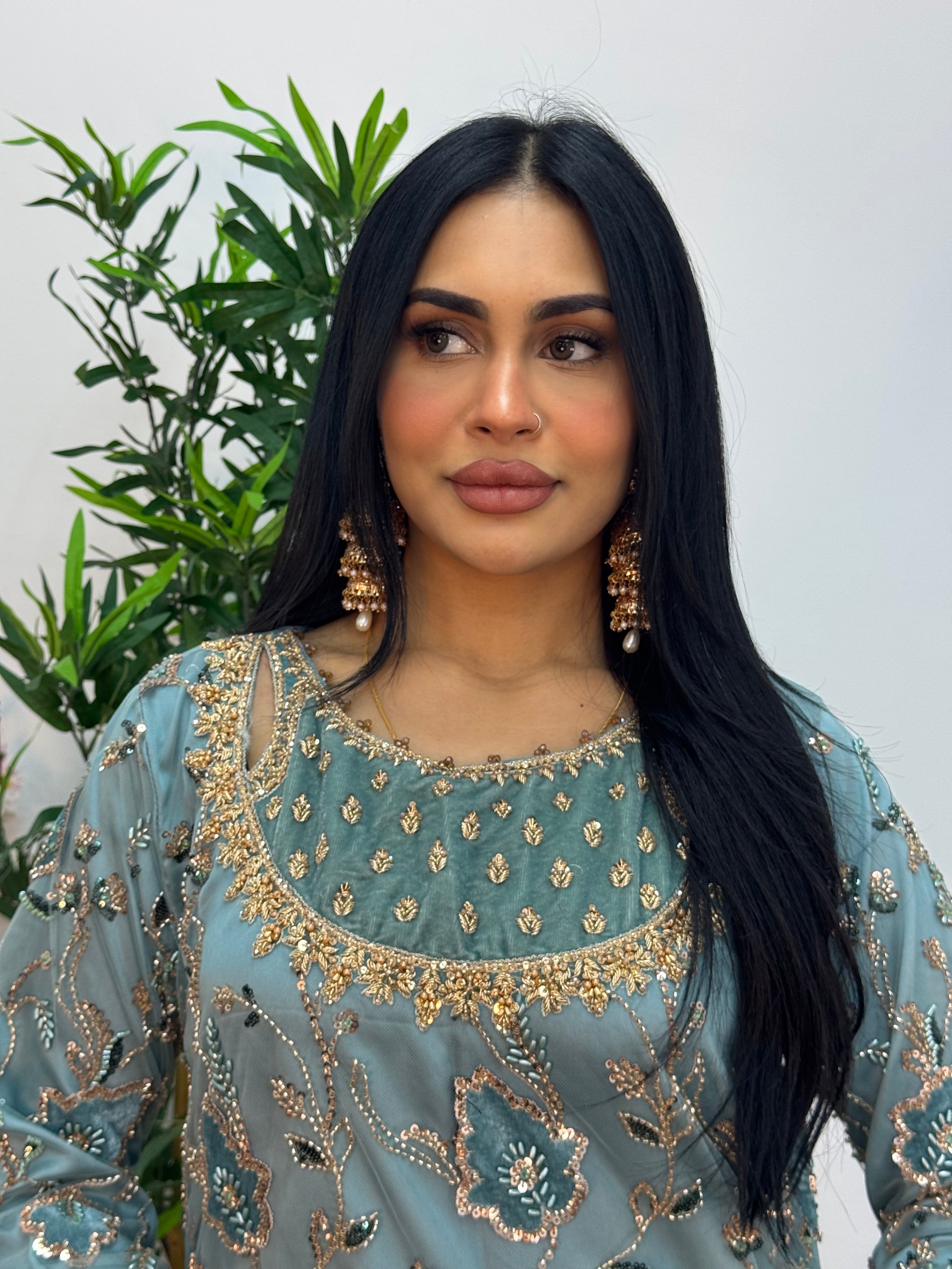 The ensemble is paired with elegant palazzo pants and a delicately embroidered dupatta, enhanced with Cutdana embroidery along both borders.