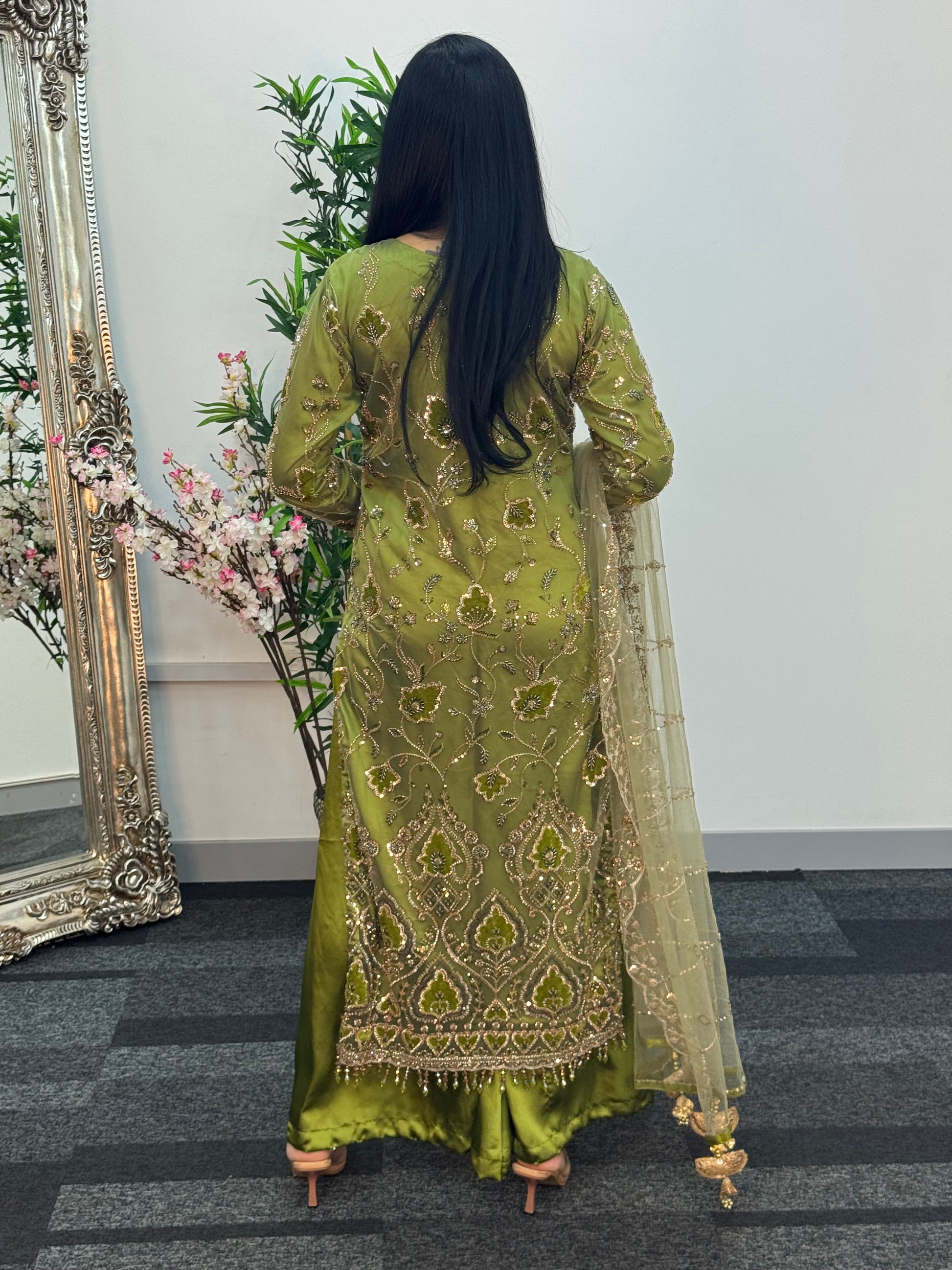 The ensemble is paired with elegant palazzo pants and a delicately embroidered dupatta, enhanced with Cutdana embroidery along both borders.