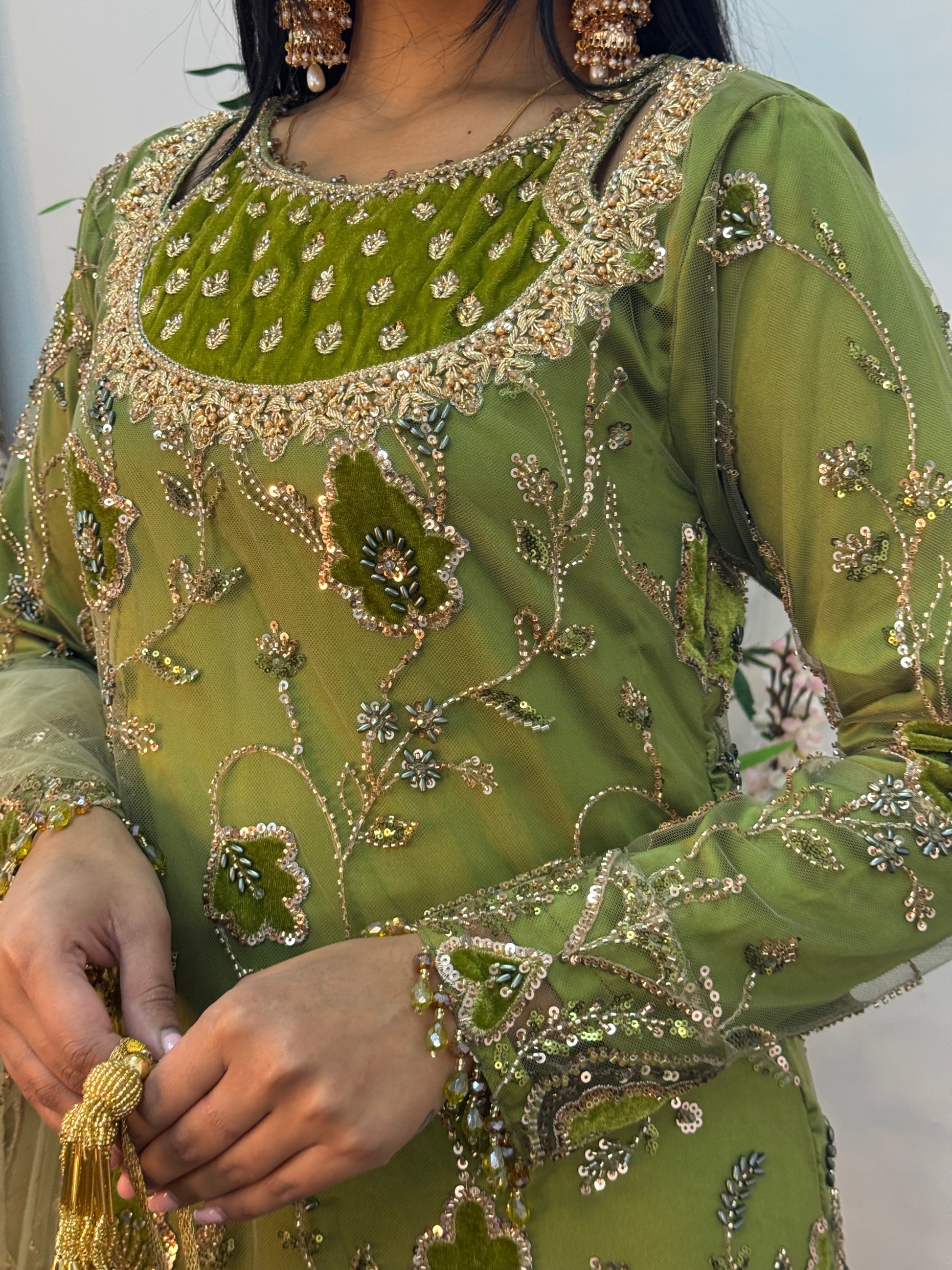 A stunning expression of luxury craftsmanship, this design features exquisite hand-embroidered Cutdana work adorning the neckline, set on rich, full velvet fabric throughout the shirt.