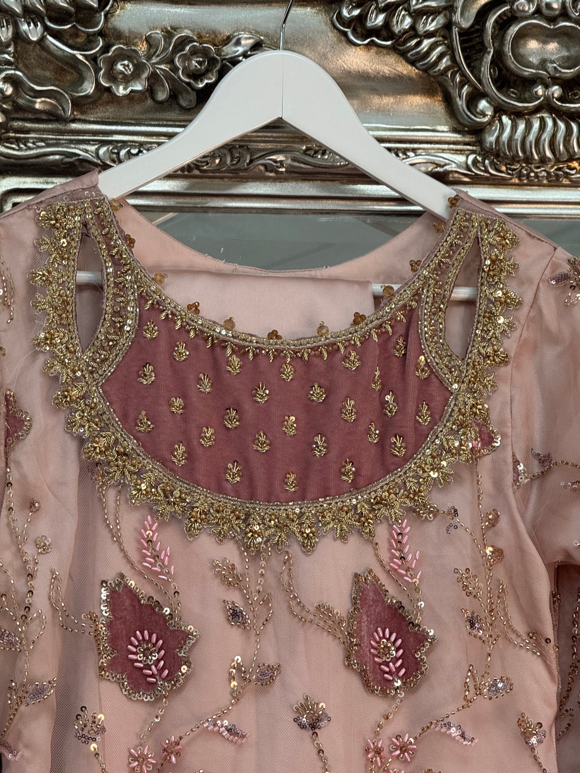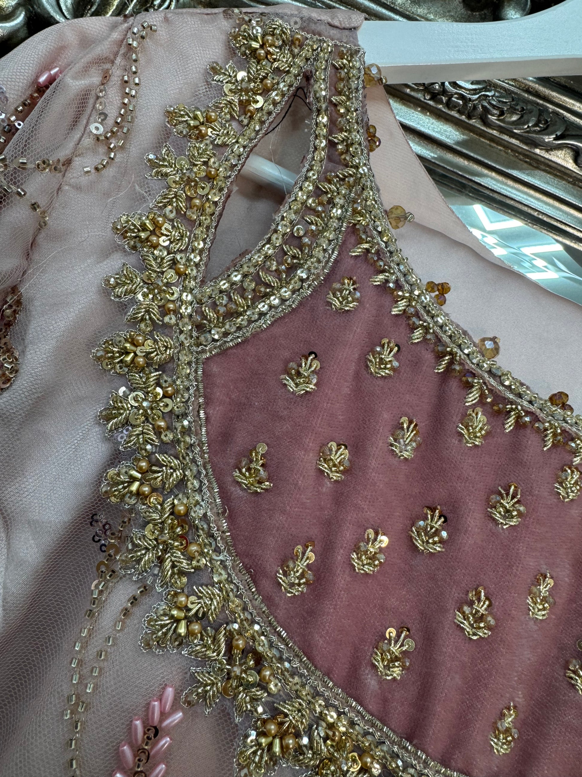 The ensemble is paired with elegant palazzo pants and a delicately embroidered dupatta, enhanced with Cutdana embroidery along both borders.