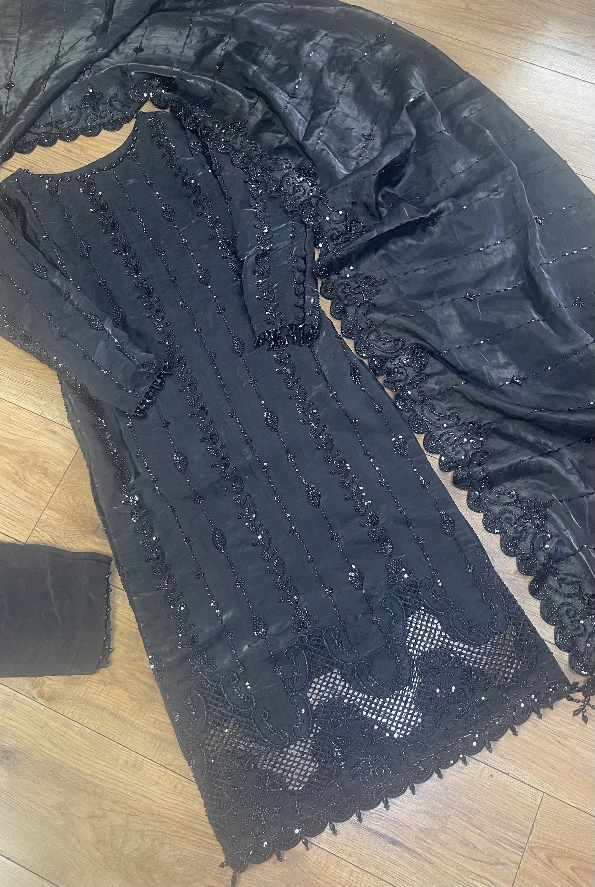 Tara - Korean Silk Cut Dana - Party Wear - CutWork - Black - taara