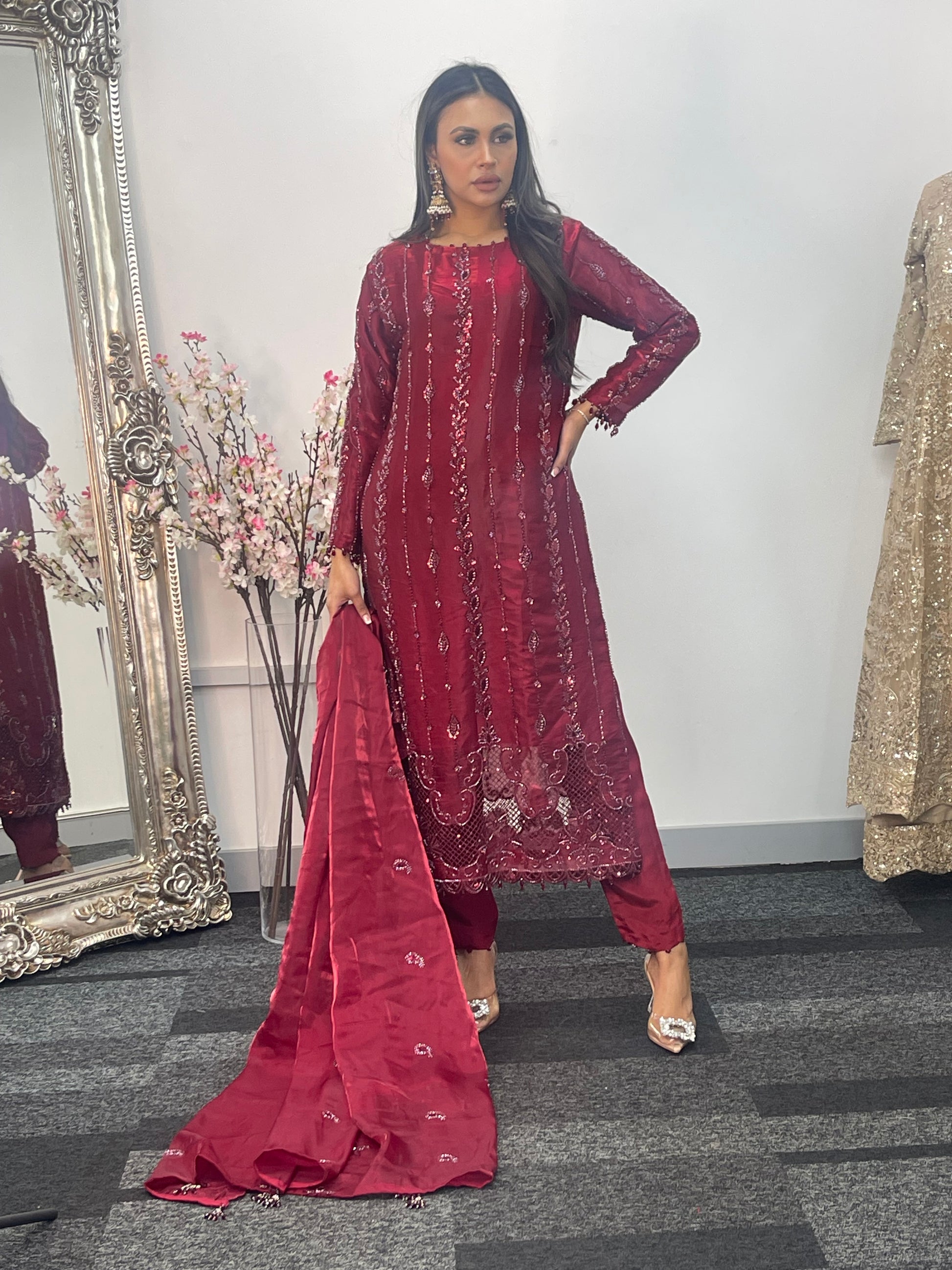 Tara - Korean Silk Cut Dana - Party Wear - CutWork - Maroon - taara