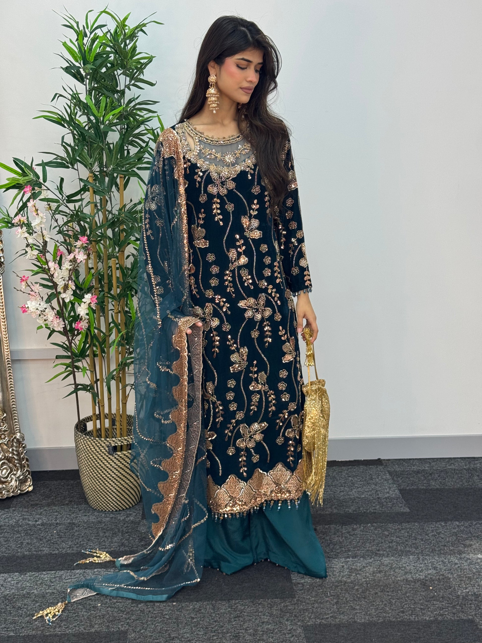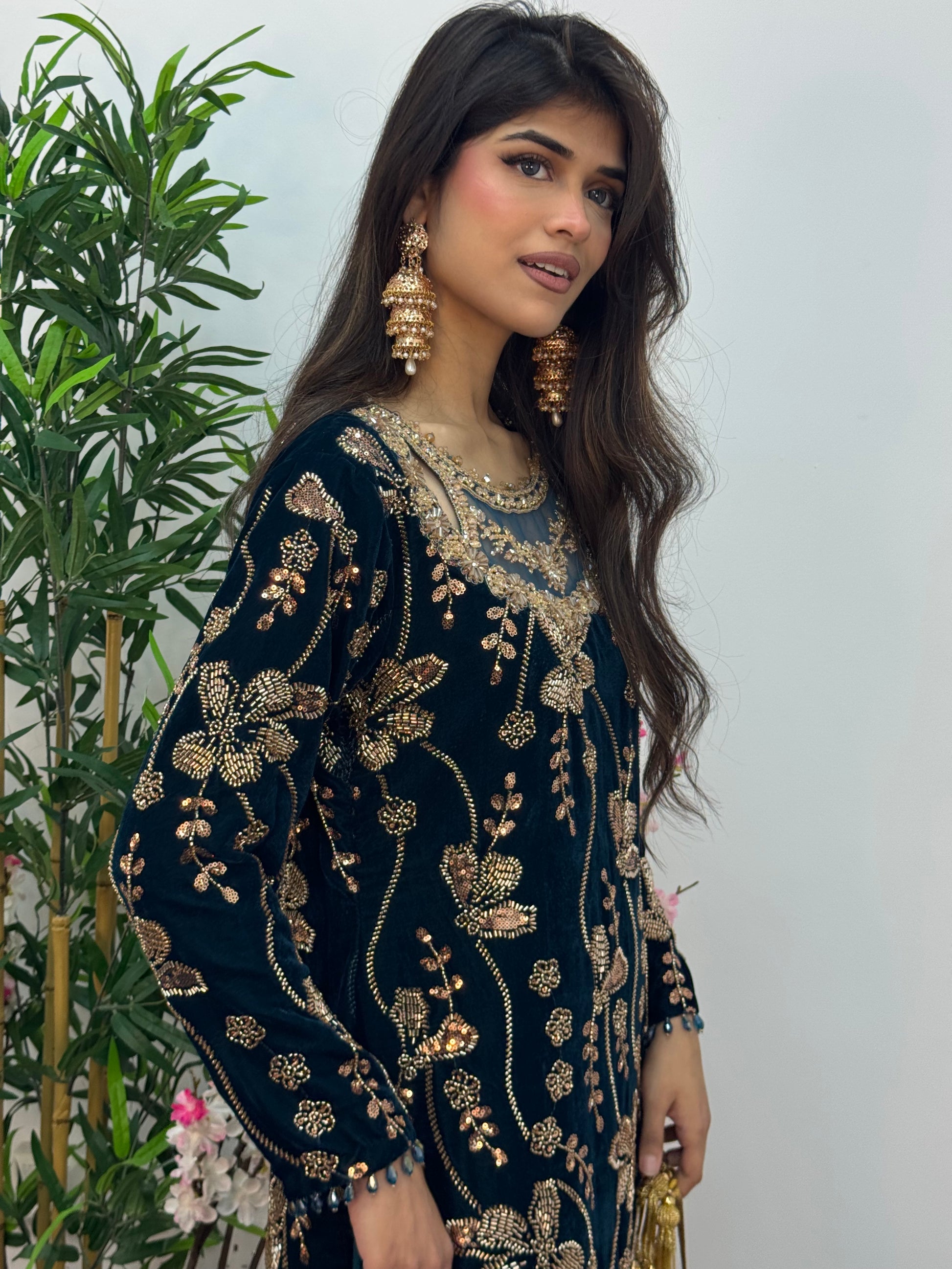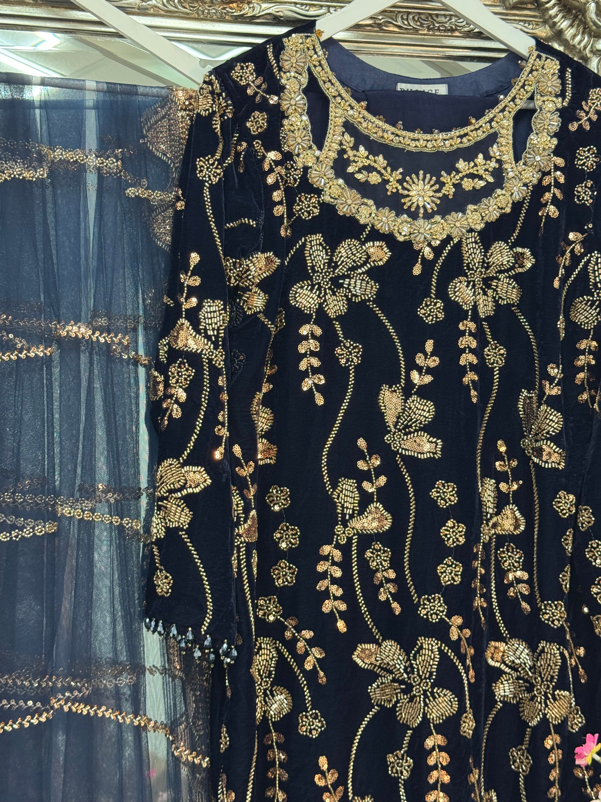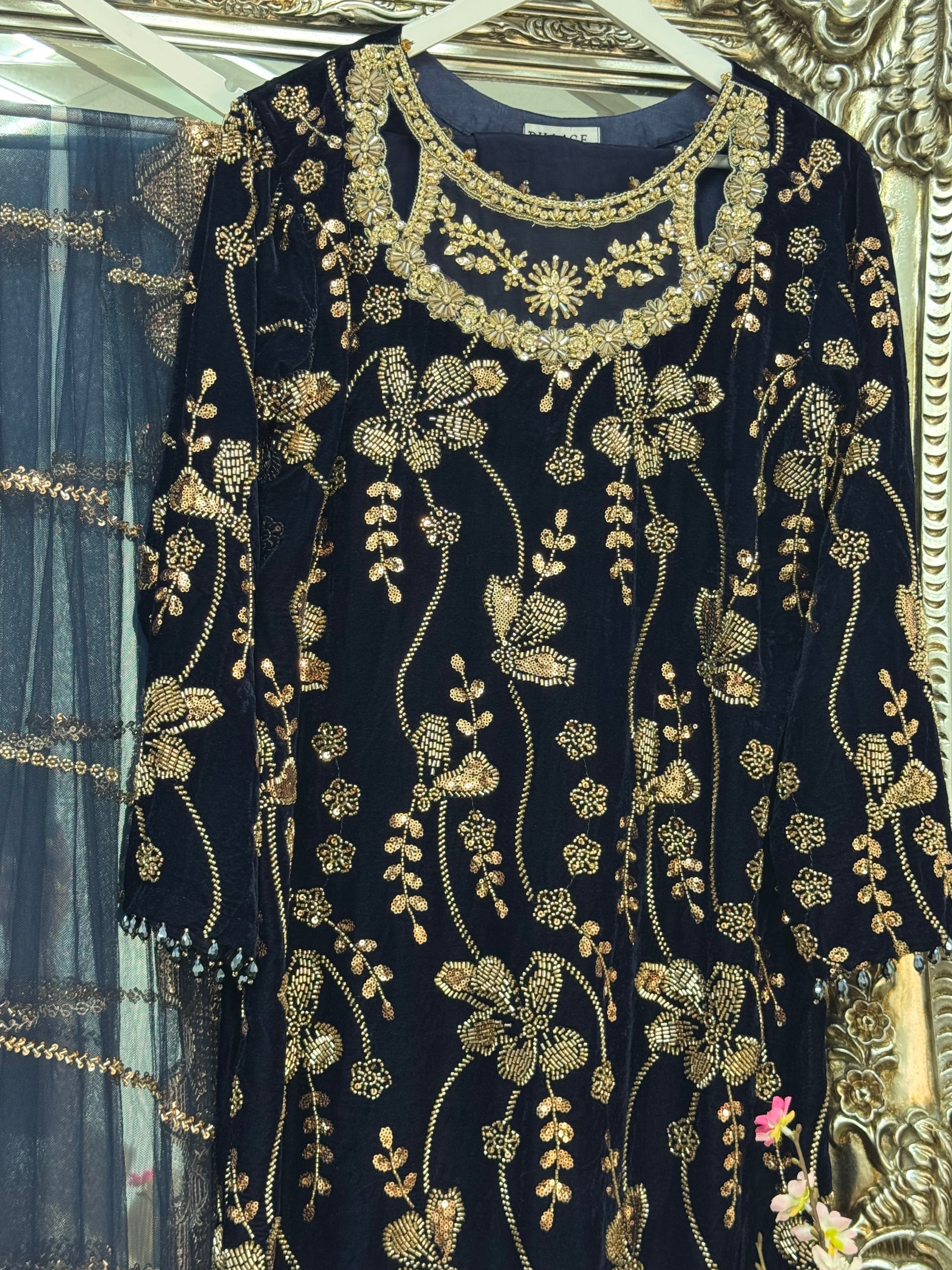 Introducing our New Velvet Cutdana Collection—a stunning blend of luxury, artistry, and contemporary elegance. Each piece showcases heavy, high-quality Cutdana embroidery meticulously crafted on the front, back, and sleeves. The neckline features an embellished adds-work design with a modern cut-out style, creating a bold yet sophisticated look.